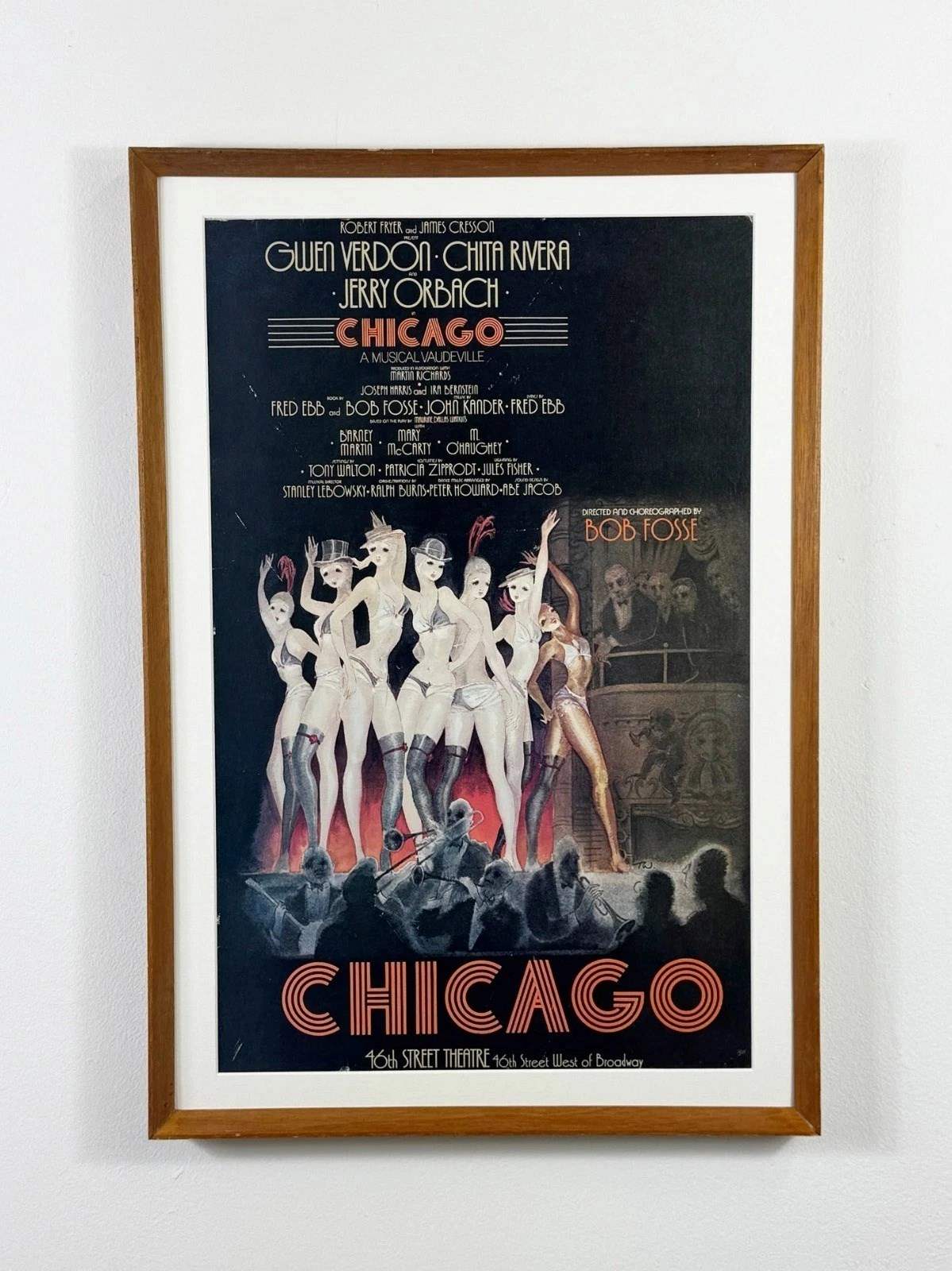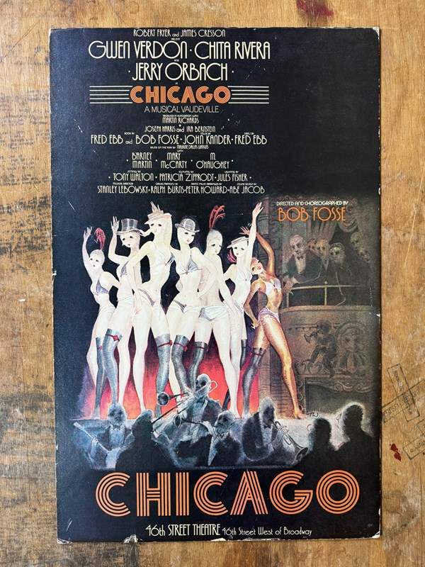 Celebrate Broadway history with this original 1970's vintage show card, from the musical Chicago. Featuring bold Art Deco typography and striking artwork of the original cast — Gwen Verdon, Chita Rivera, and Jerry Orbach, this cardstock poster (dating 1975), captures the glamour, energy, and iconic choreography of Bob Fosse’s legendary production.