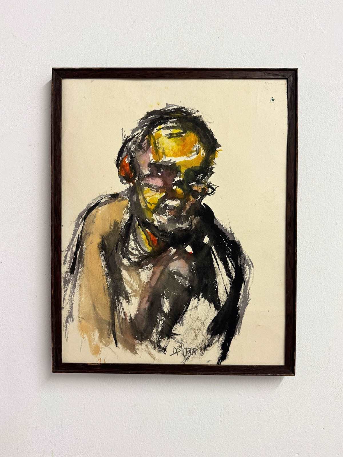 Executed on paper and signed, the composition blends earthy tones with bold, gestural strokes to create a striking contemporary figurative work.