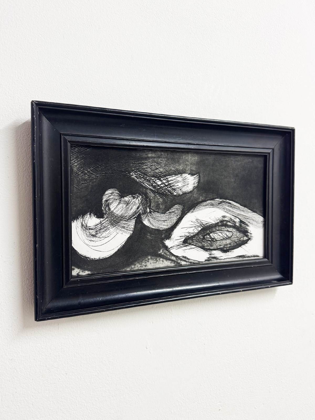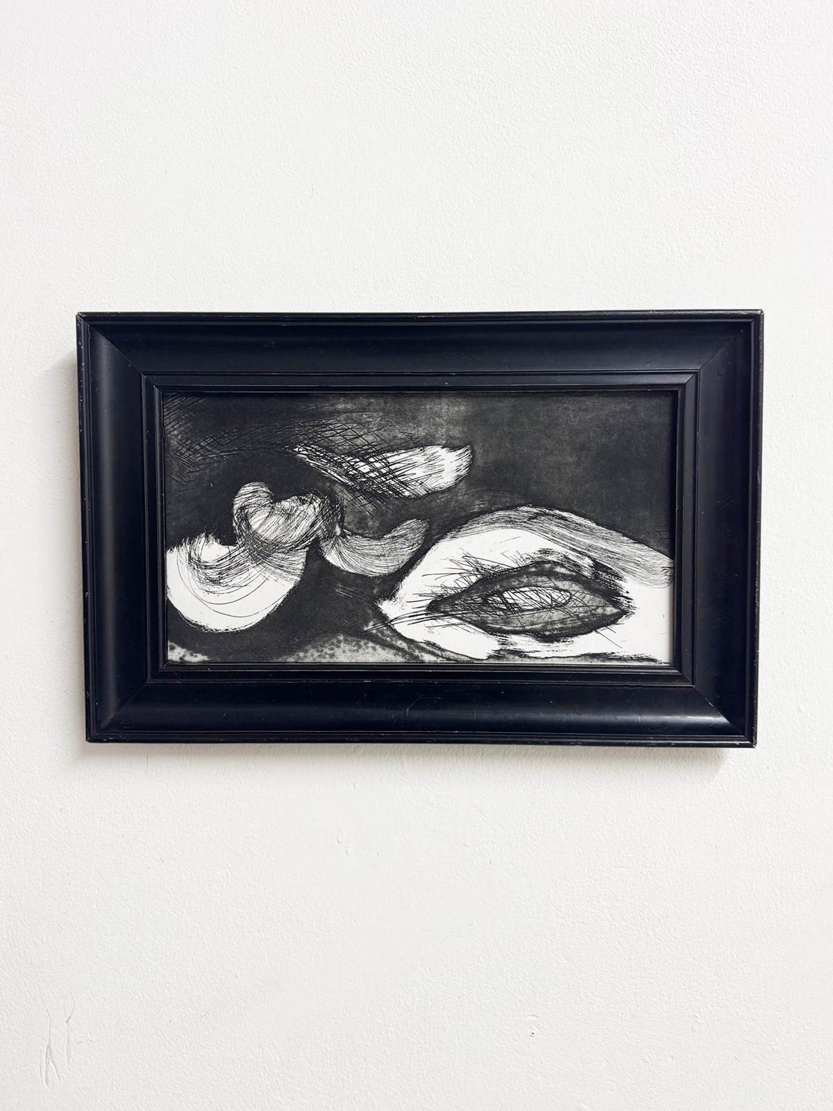 Expressive monochrome original mid century abstract painting by artist S. Cousins (signed on reverse of painting), featuring bold, textured line work. Presented in a deep Victorian ebonised frame and ready to hang. Arrives ready to hang. W: 35 x D: 3 x H: 23 cm
