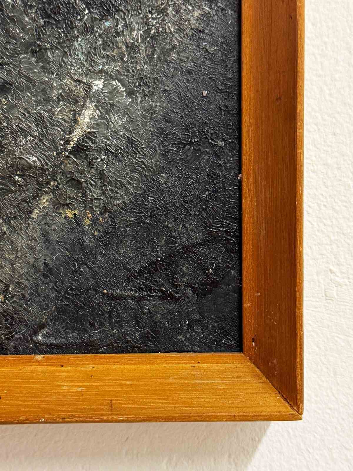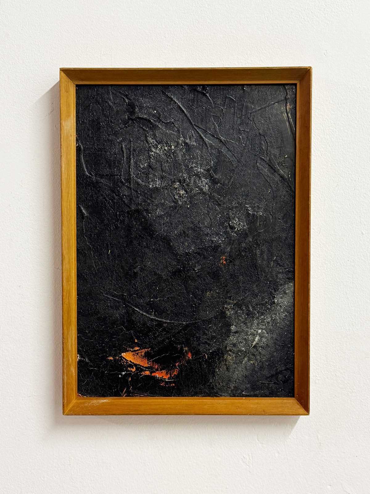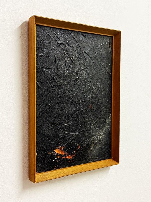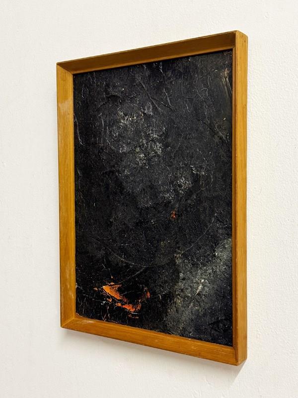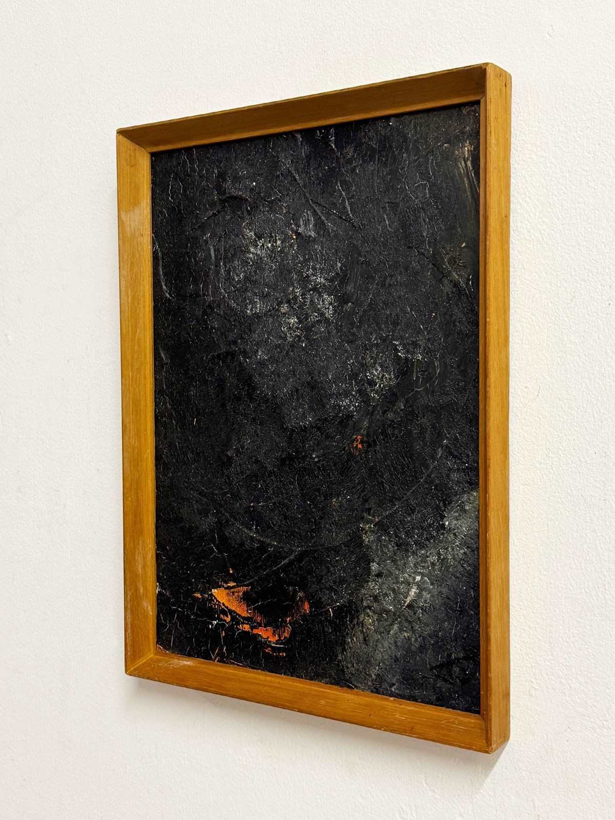 A striking original Swedish abstract painting featuring a deep black textured surface with subtle highlights and hints of orange emerging from the darkness. The piece evokes a sense of mystery and depth, perfect for modern and minimalist interiors. The heavy texture and matte finish create an engaging, tactile surface that changes with the light. Signed bottom right, JJ.