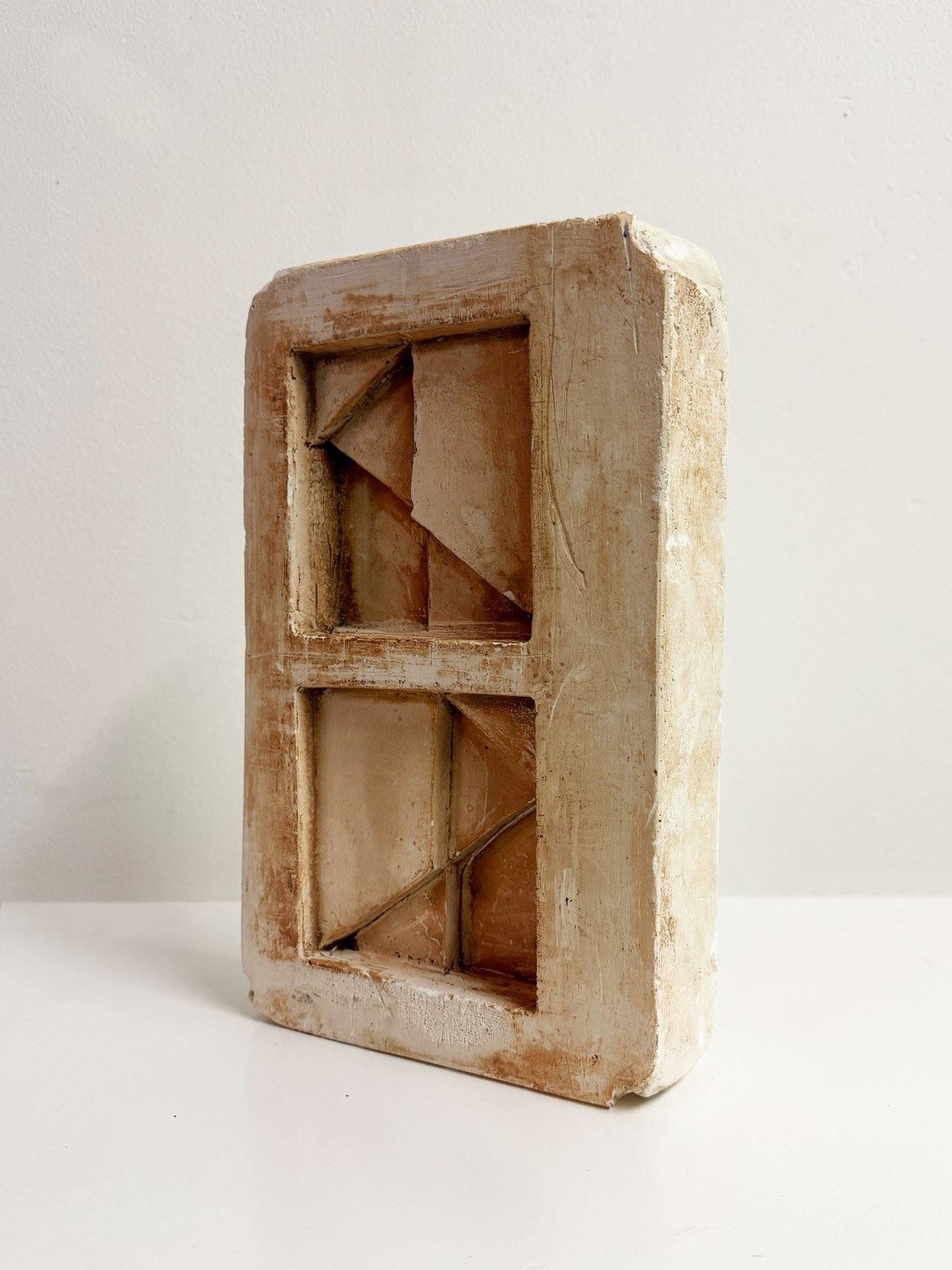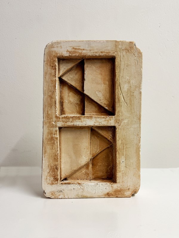 A striking Scandinavian mid century modernist plaster relief sculpture, artist initials T.W. carved into the reverse. The sculpture features two geometric compartments arranged vertically, each carved with angled, folded planes. The textured plaster surface has a beautiful warm patina and subtle imperfections that highlight its handmade, sculptural character.