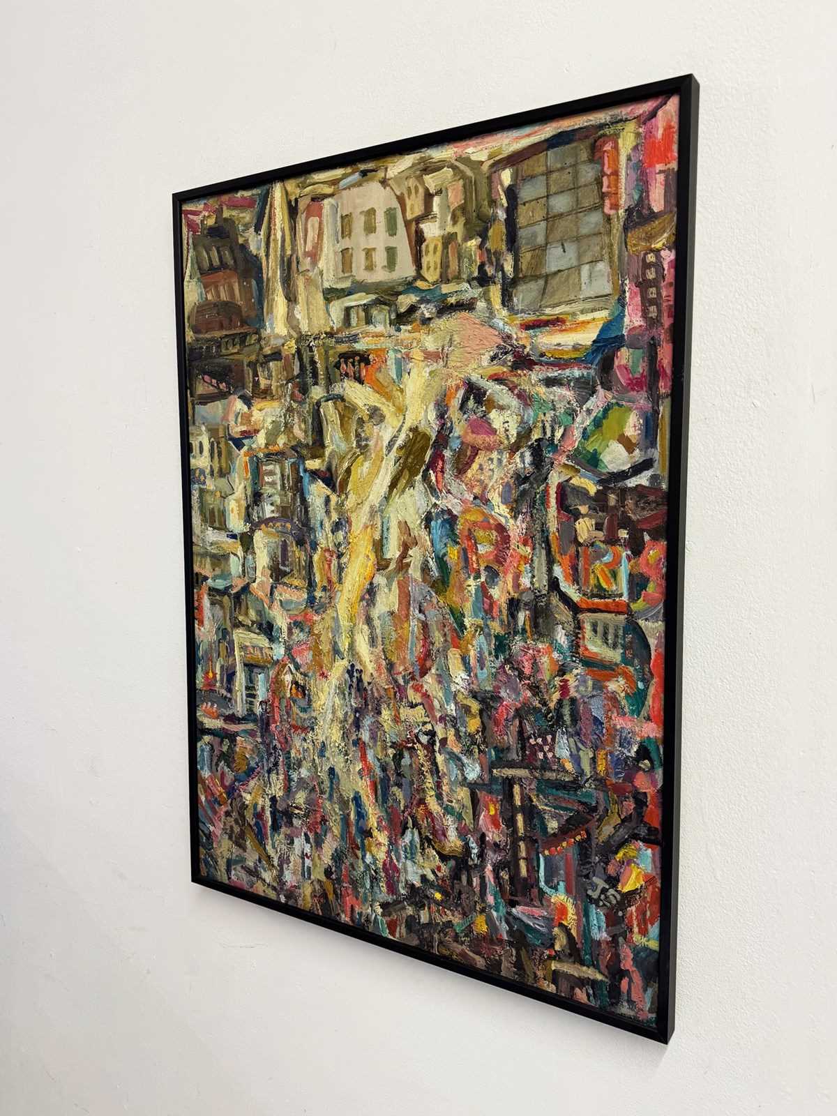 This striking mid century Swedish abstract cityscape painting captures the energy and vibrancy of an urban scene through rich texture and bold brushwork. The artist uses a dynamic palette of warm yellows, reds, blues, and earthy tones, creating a sense of movement and depth that draws the viewer in. Signed bottom right - J.S. Framed in a modern black metal frame. W: 51 x H: 71 cm