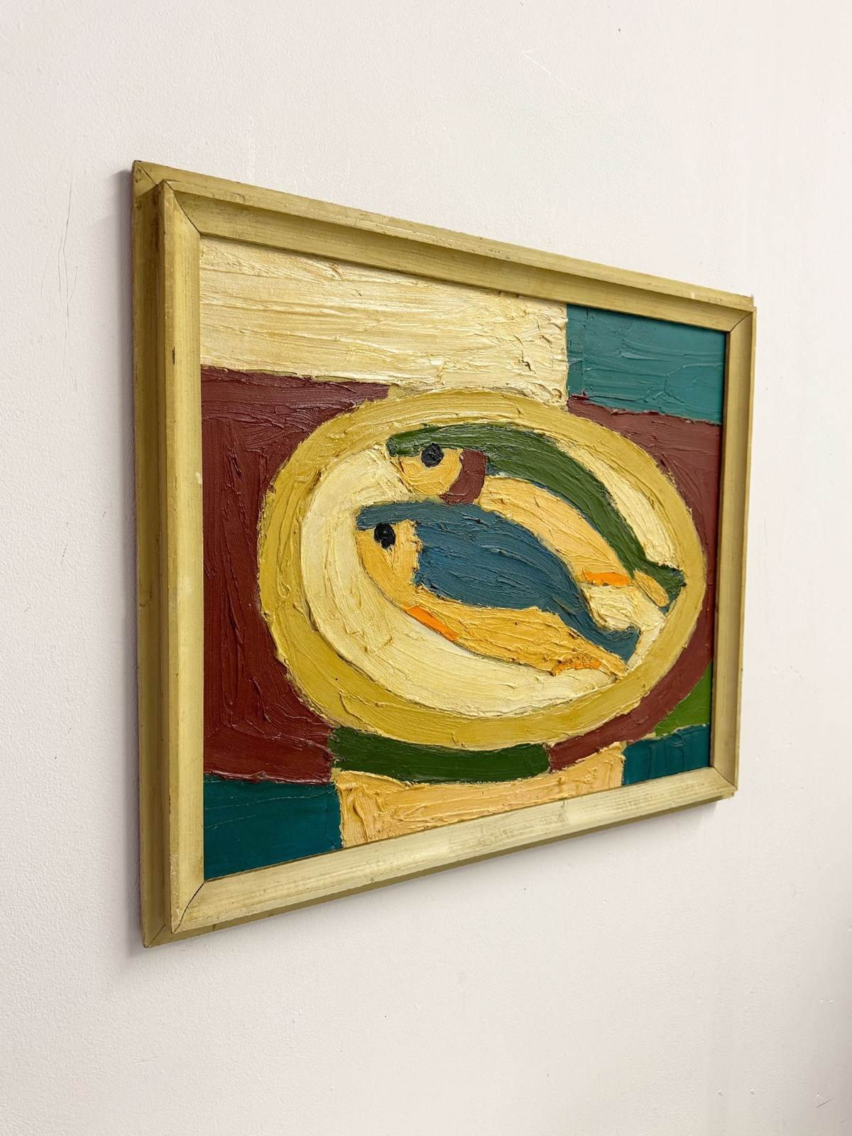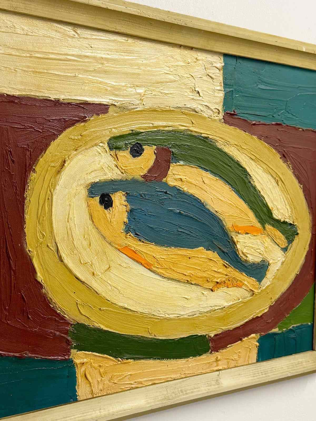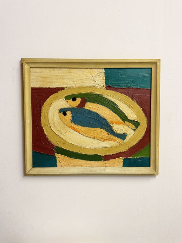 A striking Swedish mid-century style still life, this expressive oil painting depicts two stylised fish arranged on a platter, rendered with richly textured, sculptural brushwork. The composition is bold yet harmonious, combining earthy ochres, soft creams, deep greens, and muted reds, hallmarks of Scandinavian modernist design.