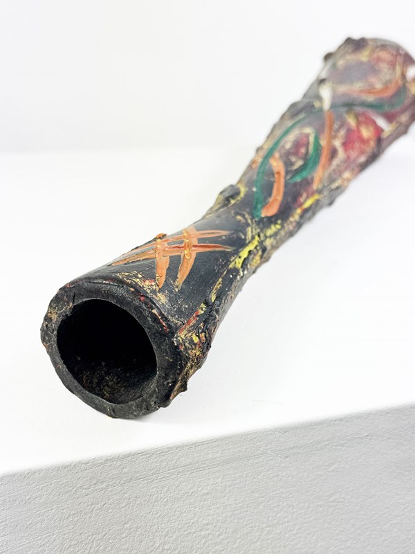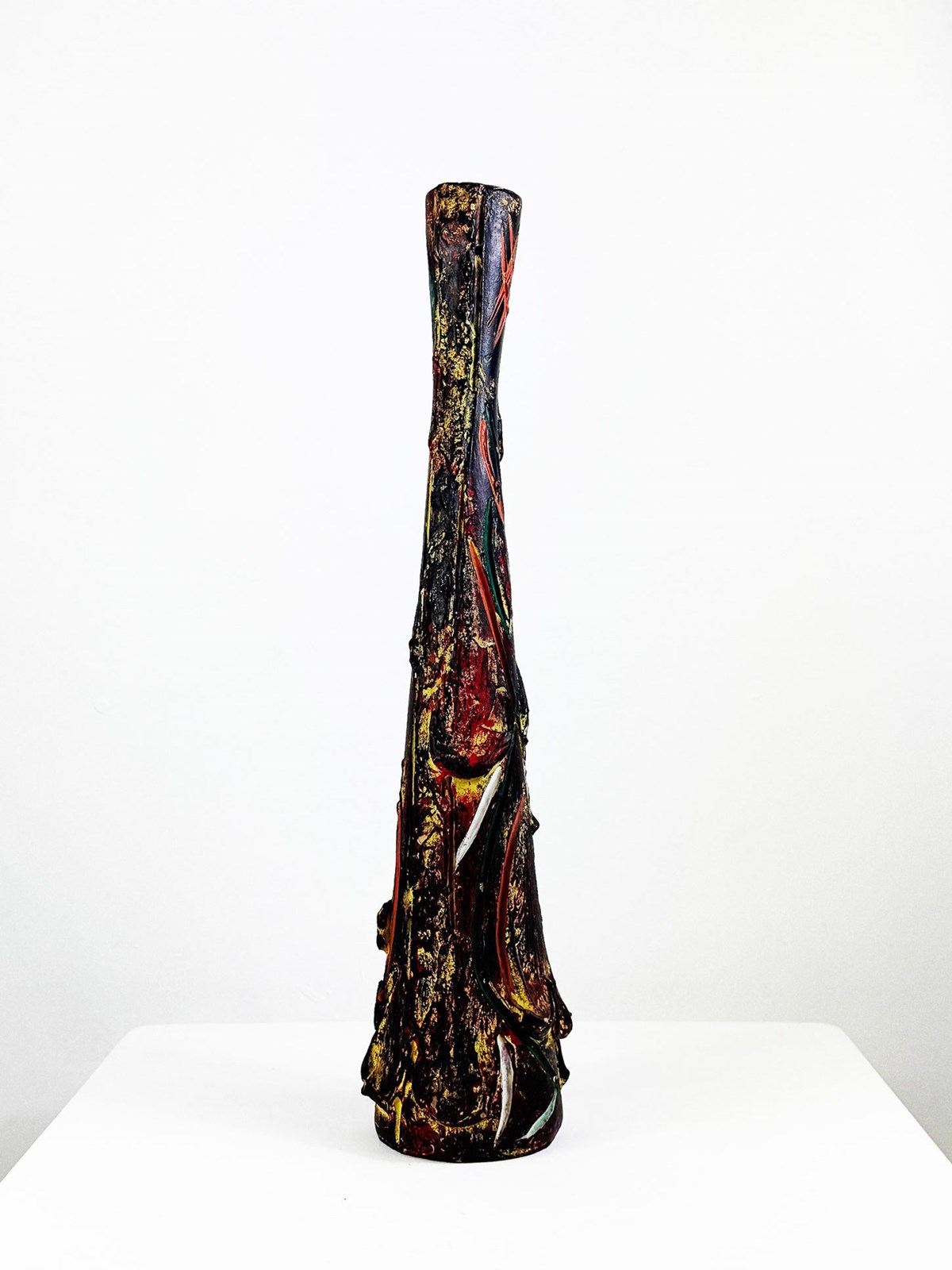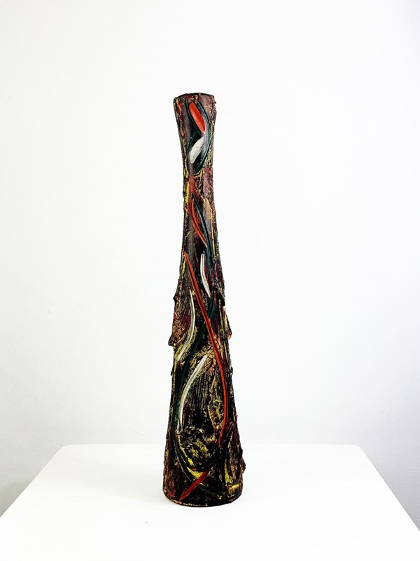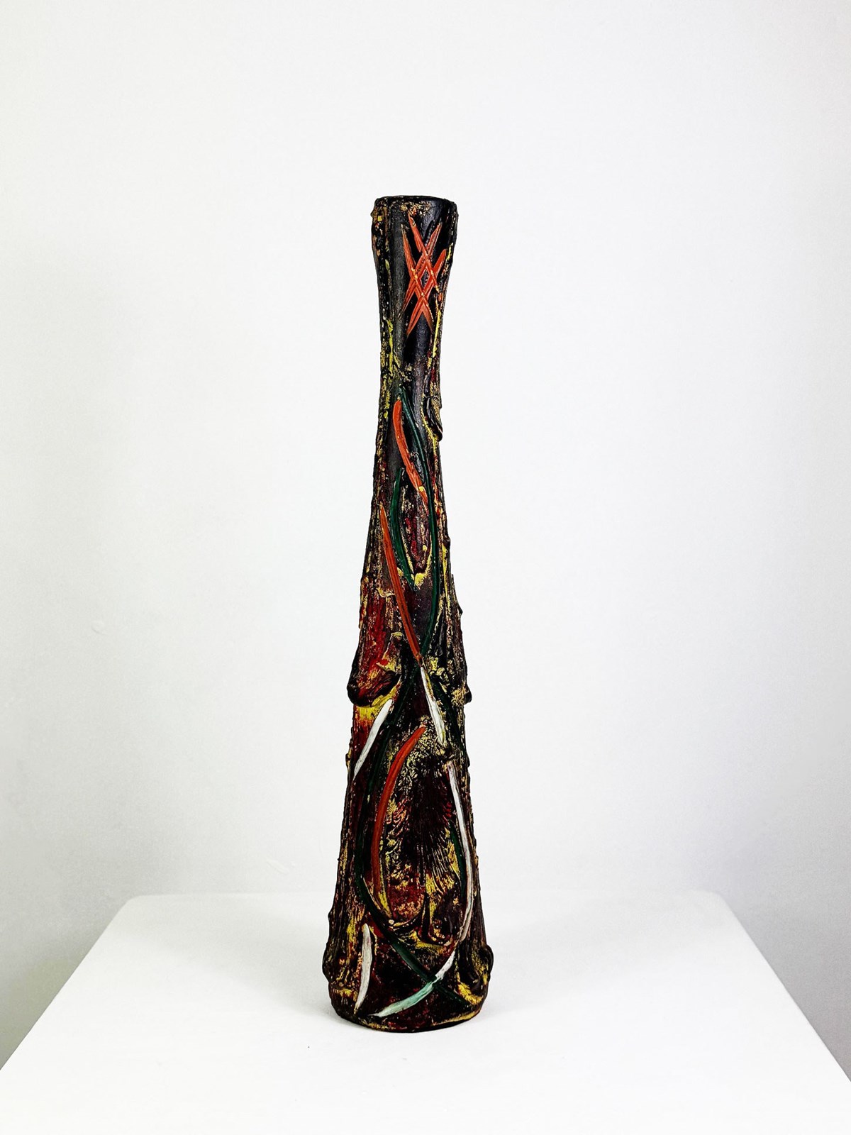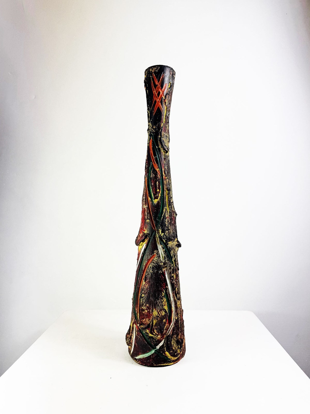 Textural mid century vase, indistinctly signed on the base. Neck diameter: 5.5 cm - Hole diameter: 3.5 cm. Dimensions (approx.): Dia: 11 x H: 53 cm