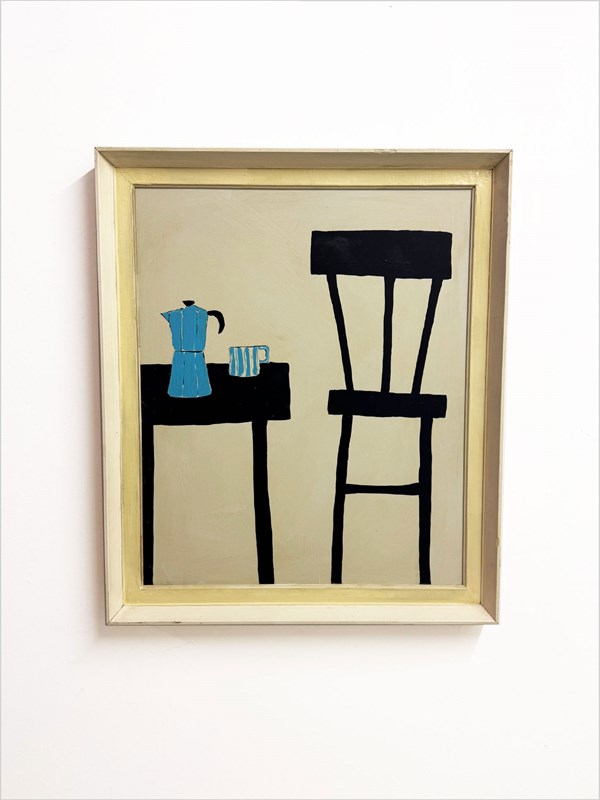 Add a touch of charm and modern simplicity to your home with this unique minimalist painting. Featuring a bold black chair and table with a bright blue moka pot and striped coffee mug, this design is perfect for coffee lovers and fans of Scandinavian or contemporary decor.