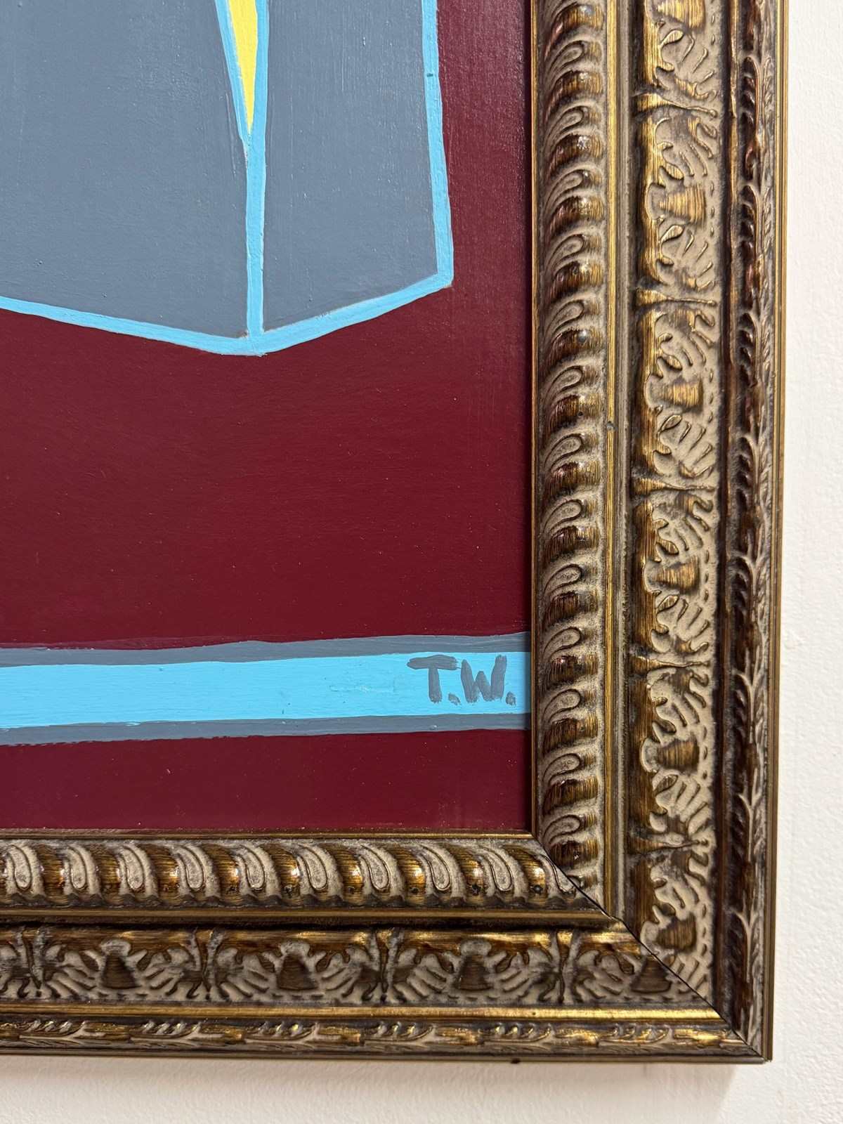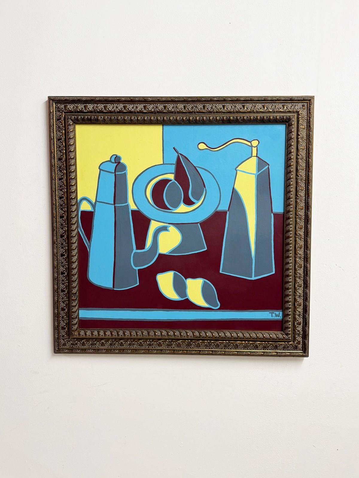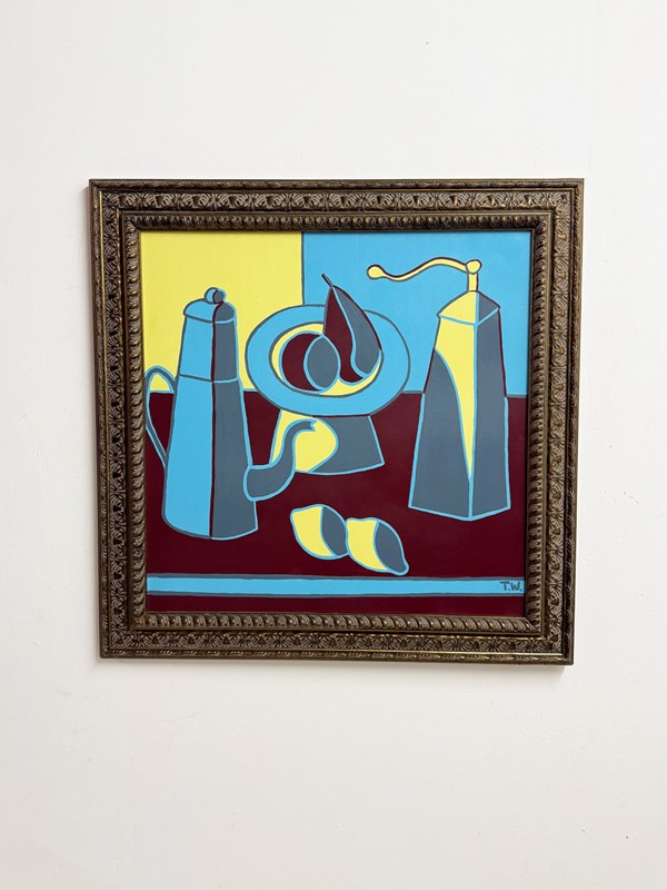 Celebrate Nordic modernism with this striking vintage still life oil painting by Terence R. Wood. Rendered in bold mid-century style, expressive burgundy lines against a warm cream backdrop. The simplified geometric forms and vibrant palette embody the clean lines and understated elegance of Scandinavian design.