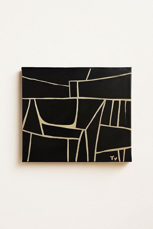 This striking abstract painting by Terence R. Wood features bold black fields defined by clean off-white geometric lines, creating a minimalist yet powerful composition. The balance of form and contrast captures a timeless modern aesthetic, making this piece a standout addition to any interior.
