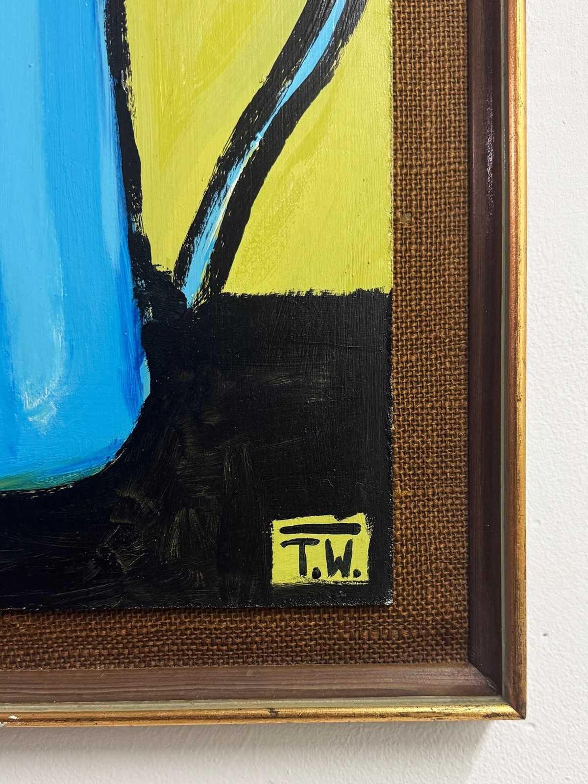 Original still life by Terence R. Wood, featuring a bold blue teapot rendered with strong black outlining and vibrant colour contrasts. Set against a striking yellow background, this modernist still life reflects a hard-edge contemporary painting style, with clean lines and confident simplicity. A distinctive statement piece, beautifully framed and ready to hang.