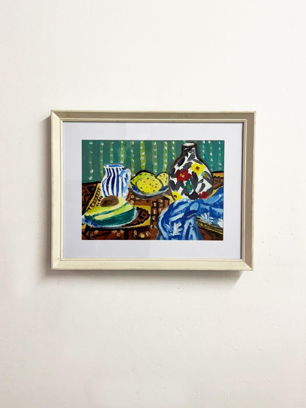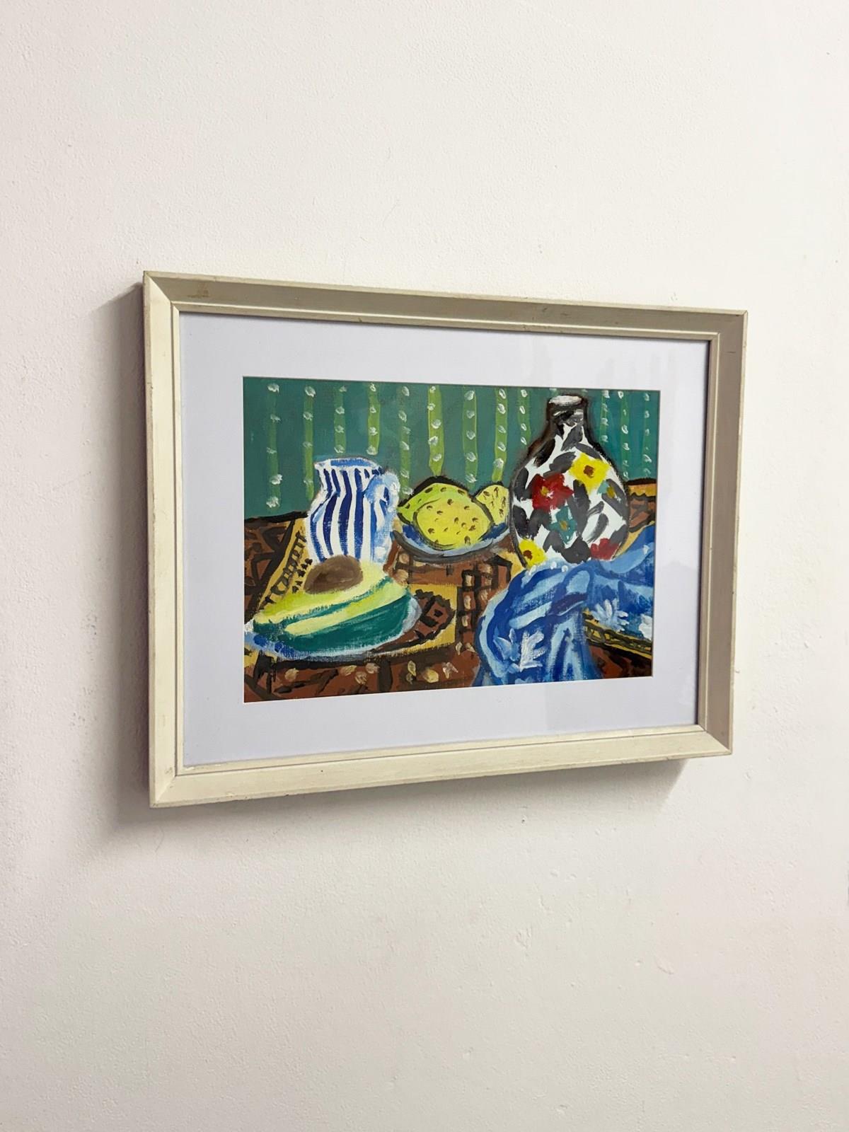 Add a pop of colour and character to your space with this charming original vintage still life painting. Featuring a lively arrangement of patterned ceramics, bright lemons, and rich textiles, the artwork captures the warmth and energy of a classic tabletop scene. The bold brushstrokes and expressive colours create a playful yet sophisticated composition that draws the eye and brightens any room. Arrives ready to hang.