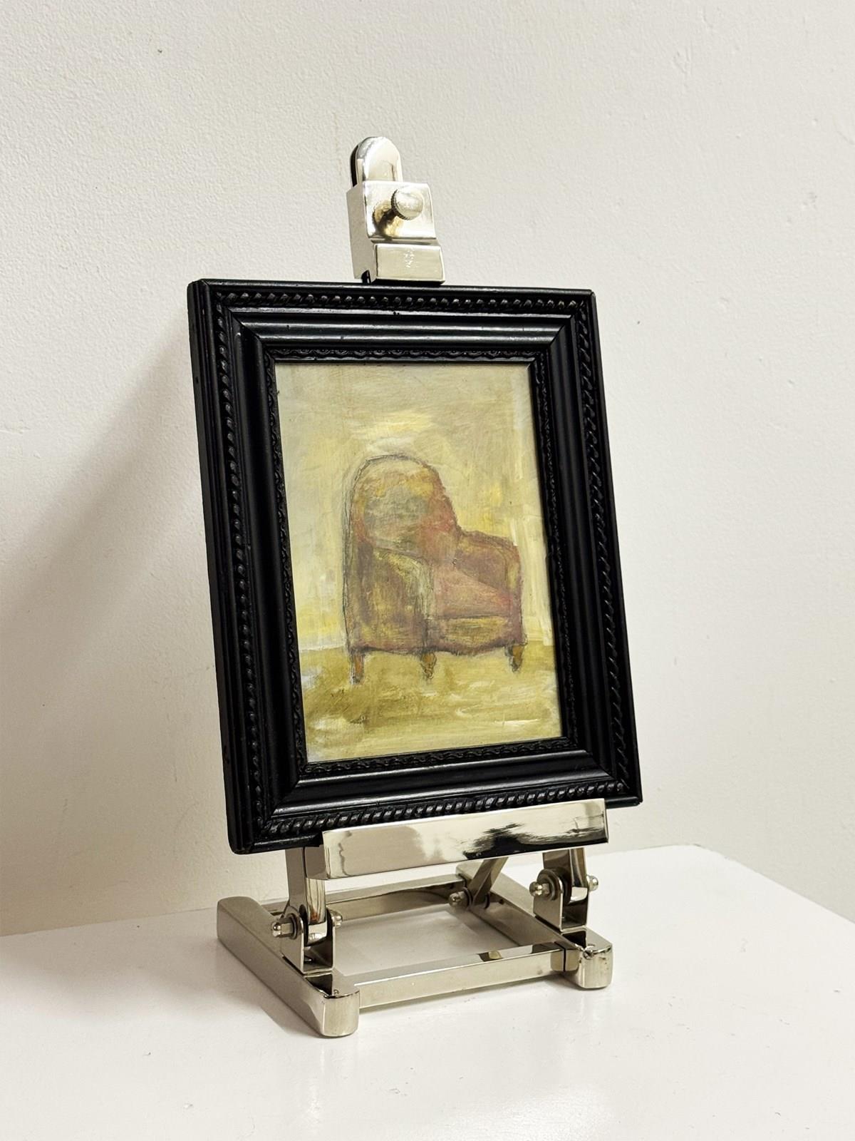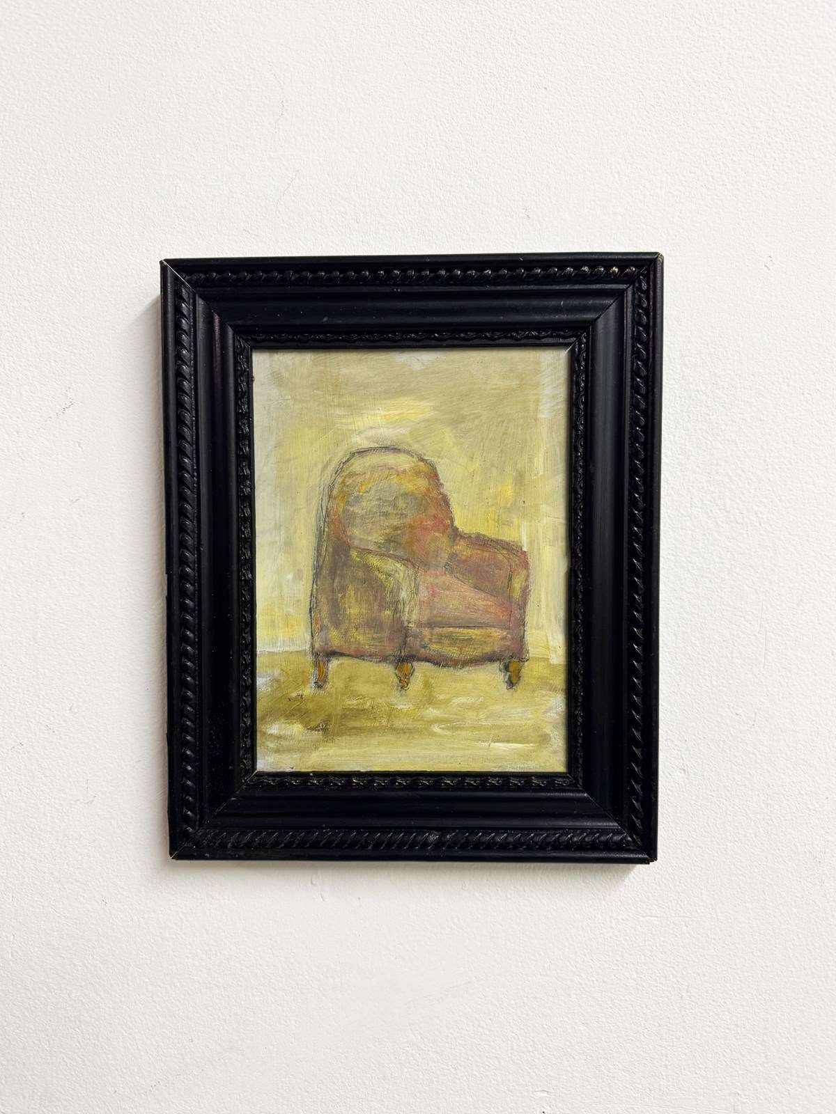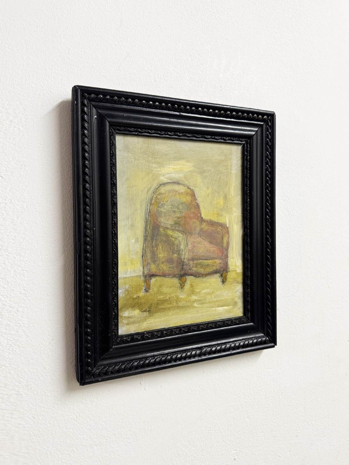 An original vintage oil painting featuring an armchair, composed in warm, earthy tones with expressive brushwork. The soft yellow background gives the piece a calm, understated presence, making it a versatile fit for a range of interiors. The artwork is set in a decorative black frame and arrives ready to hang.