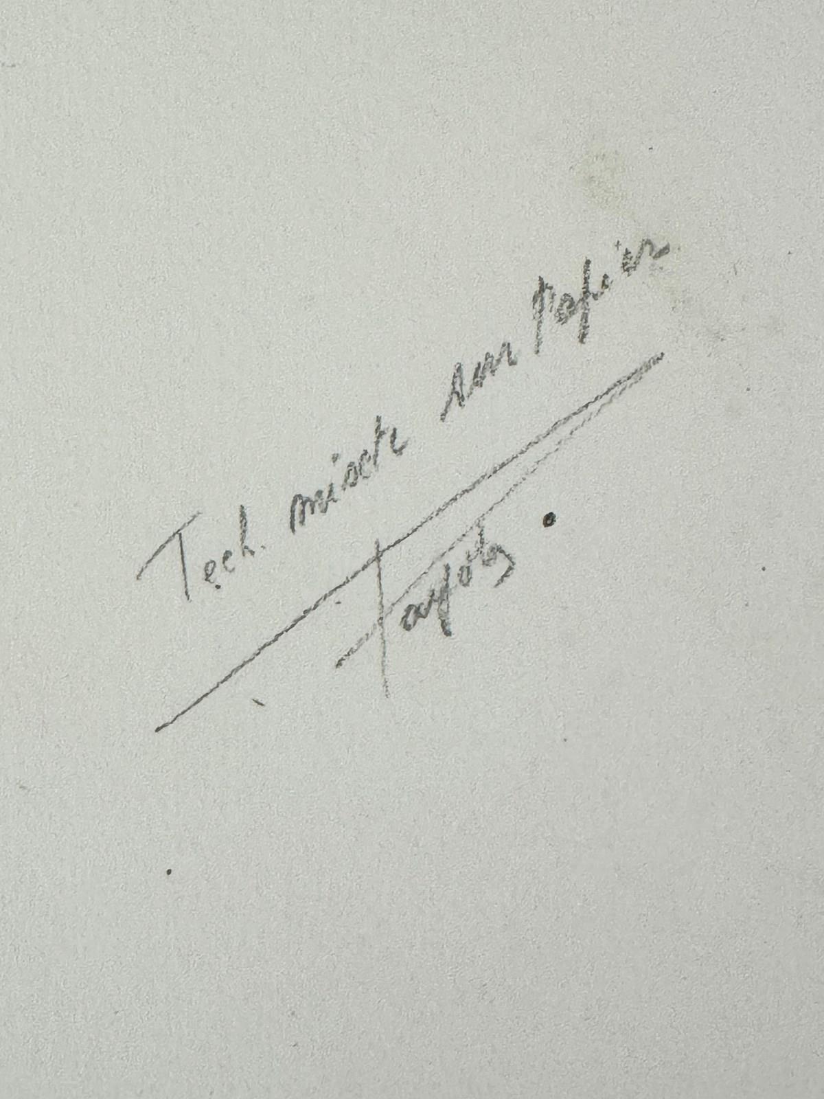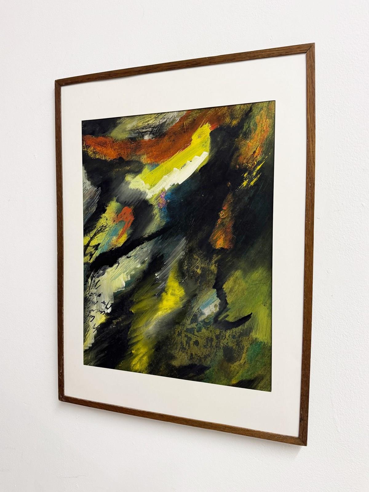 Vibrant abstract composition from Belgium, by Payot Mauf, dated 1970's, featuring bold strokes of yellow, green, orange, and black.Mixed media on paper, signed on the reverse in pencil. Presented in a simple period oak frame with white mat. Approximate frame size: W: 46.5 x D: 1.5 x H: 62 cm