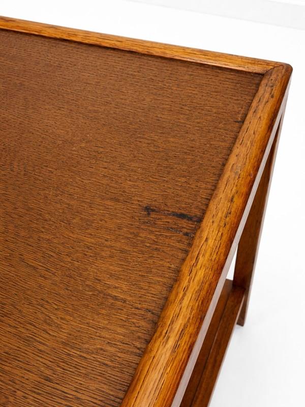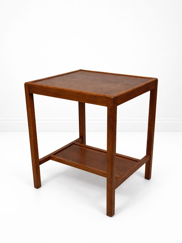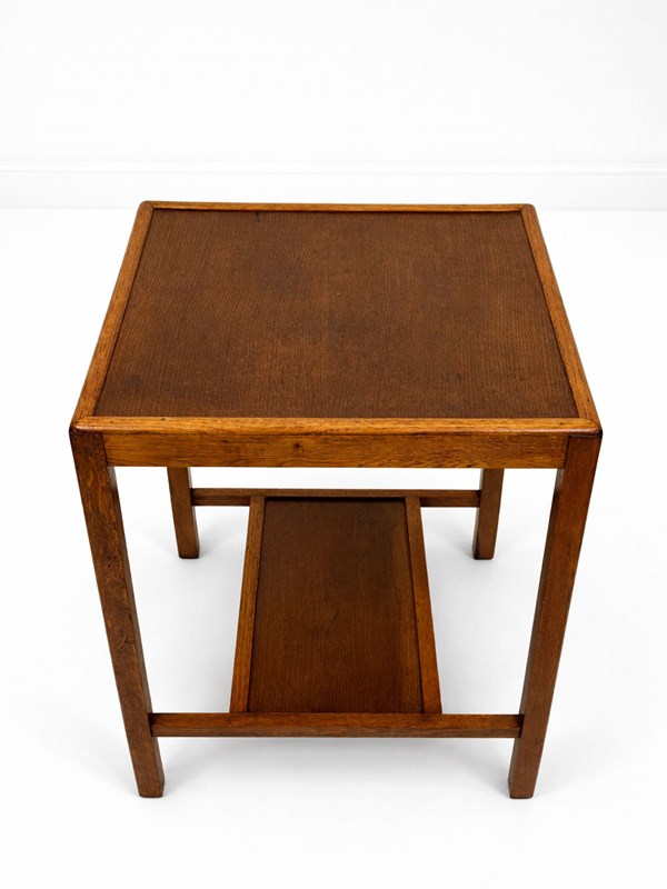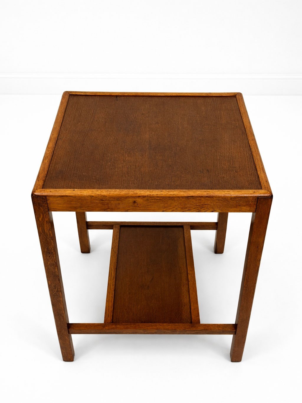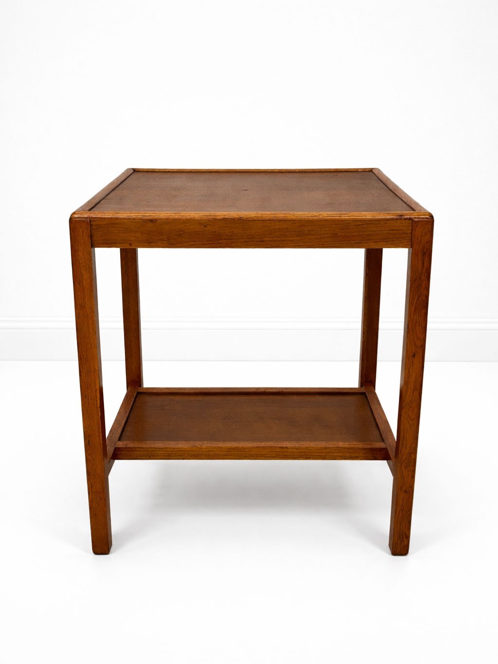 Crafted from oak, this piece embodies the honest, functional design of wartime Britain. The table features a square top with a subtly raised edge, straight legs, and a practical lower shelf, typical of the restrained and efficient construction required during the period.