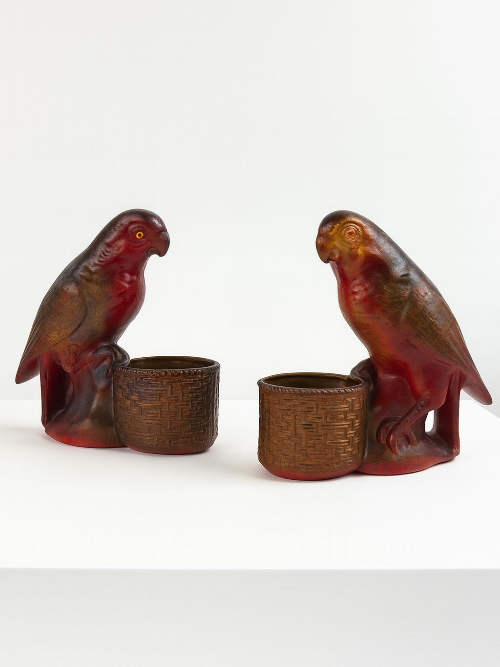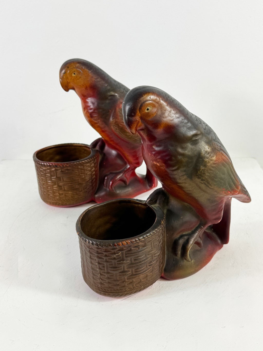 Bring a touch of early vintage charm to your home with this set of antique chalkware carnival prizes, featuring two parrots perched beside woven basket planters and a graceful swan planter. These colorful hand-painted chalkware pieces were popular as fun fair and carnival prizes in the 1930s, making them nostalgic collectibles.