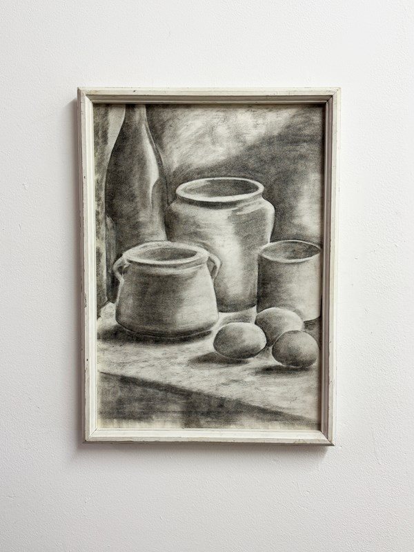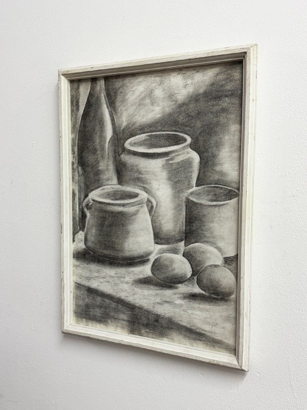 A beautiful vintage hand-drawn charcoal still life featuring classic vessels and fruit. The artist’s use of shading and texture brings depth and softness to the scene, giving it an elegant, timeless quality. This one-of-a-kind piece has a rustic, vintage charm that makes it perfect for both modern and traditional interiors.