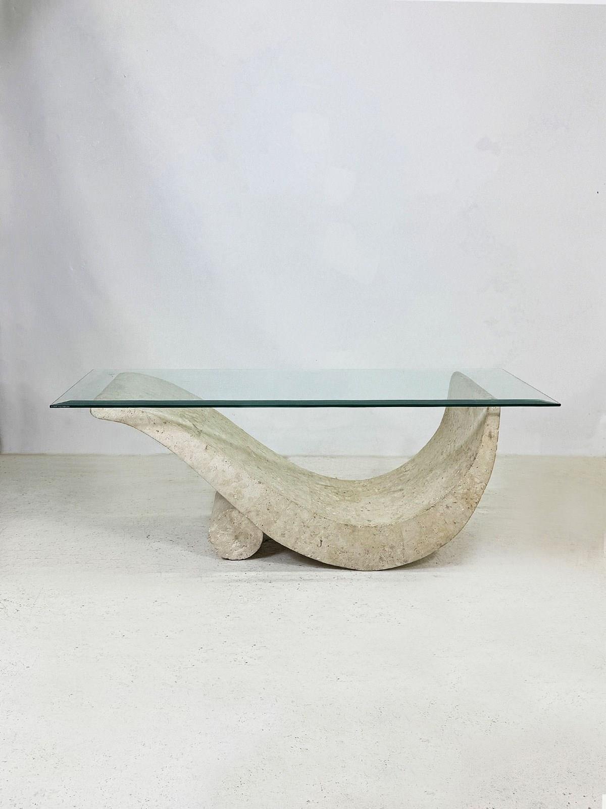 A striking 1980s postmodern coffee table featuring a sculptural base crafted from tessellated Mactan stone or fossil stone, topped with a thick, bevelled glass plate. The interplay of natural stone and crisp glass creates a bold, architectural silhouette with a distinctly Italian design influence.