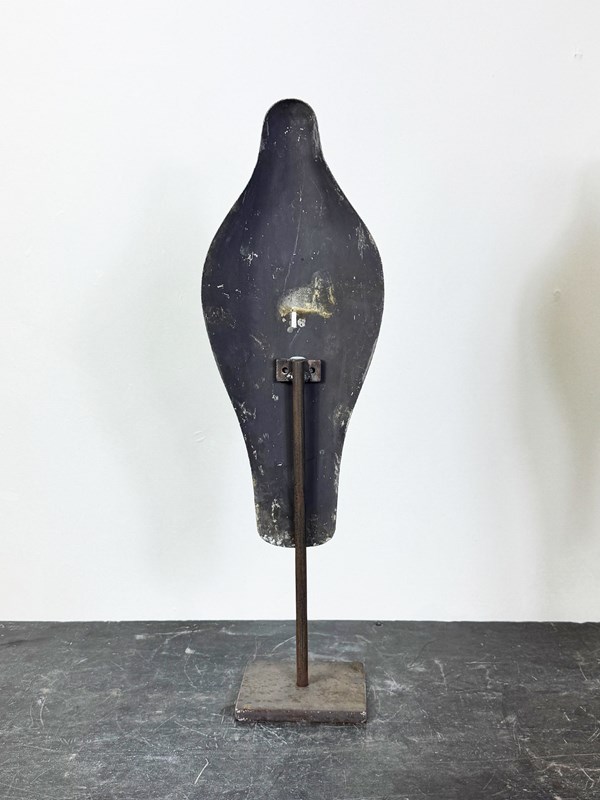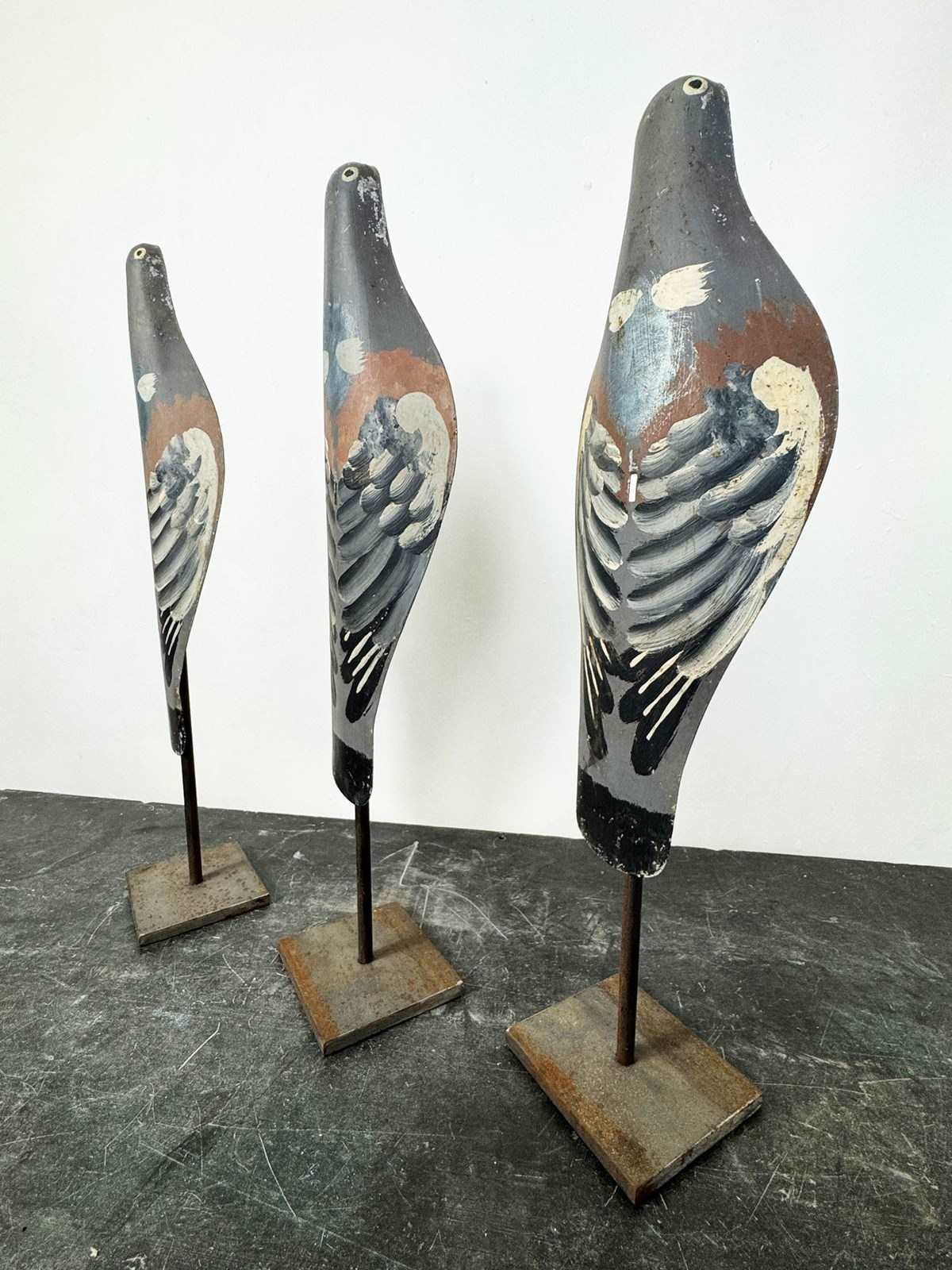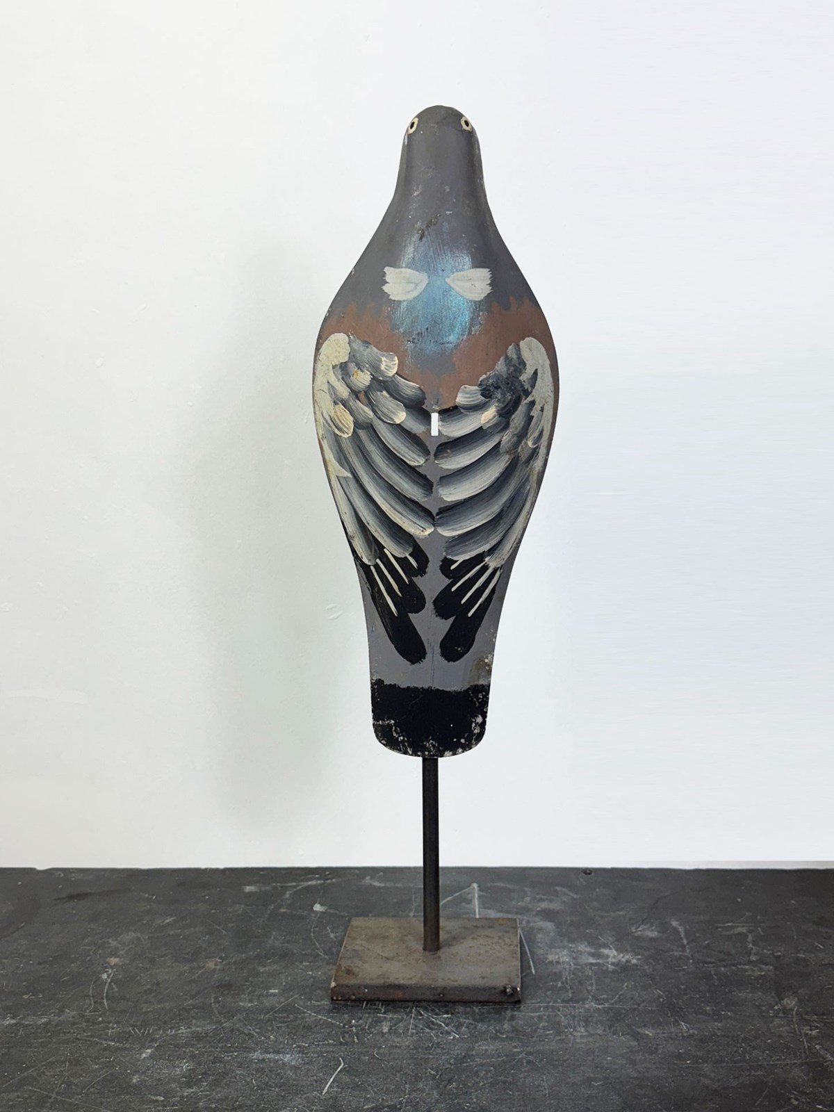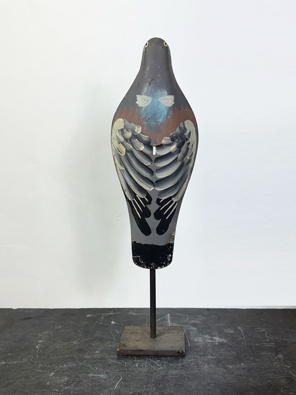 Vintage metal aluminium pigeon , combining artistic form with historical function. Likely designed as motion decoys or decorative birds, they feature a small central hole, originally used to mount the figures on sticks, allowing them to pivot and move gracefully in the wind. A shiny patch near the head served a practical purpose, to catch the light and signal presence to birds in flight.