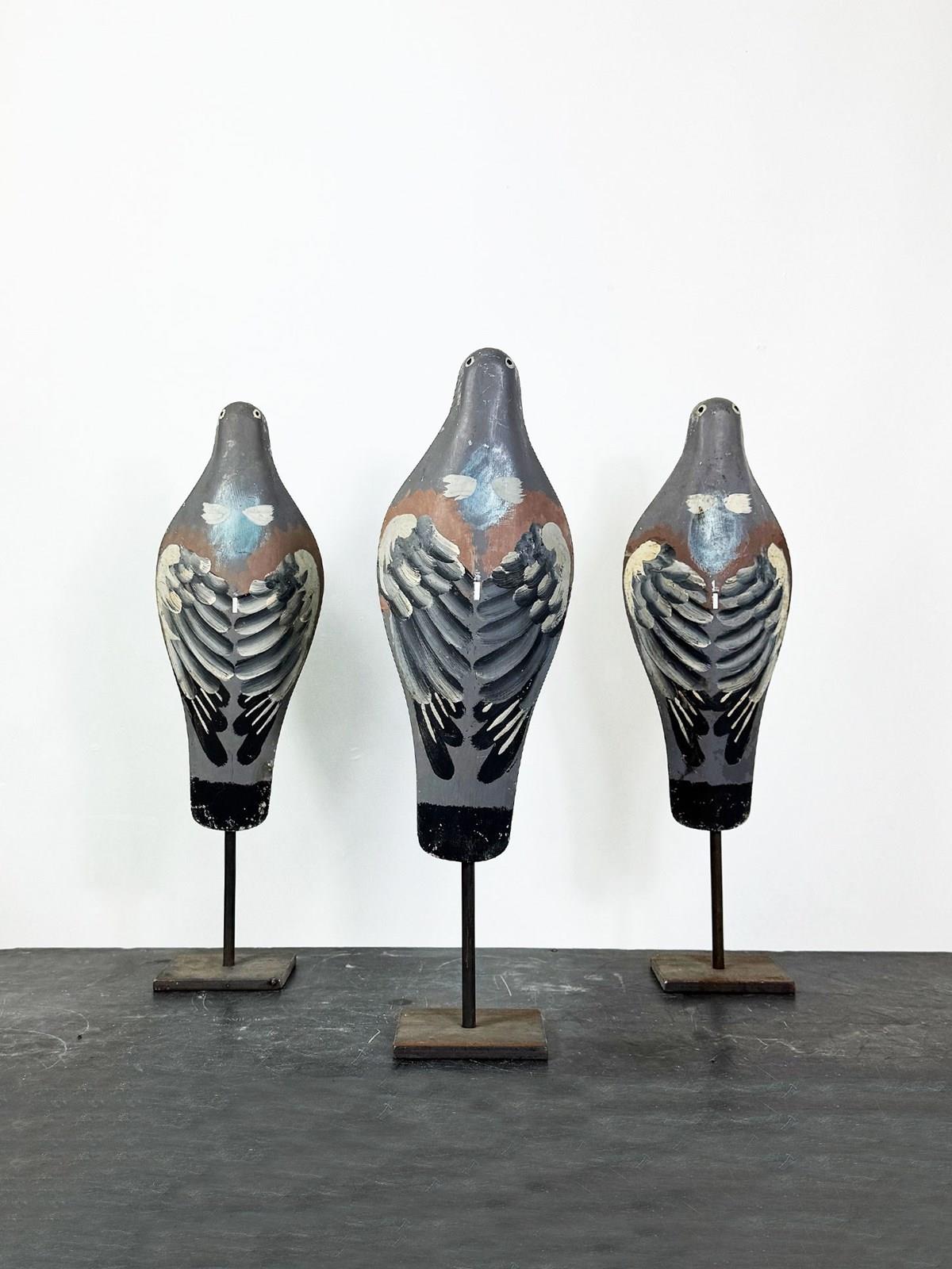 Now mounted on a minimalist metal display stand, the pigeons transform into a refined decorative object, embodying both post war materials and rustic charm.