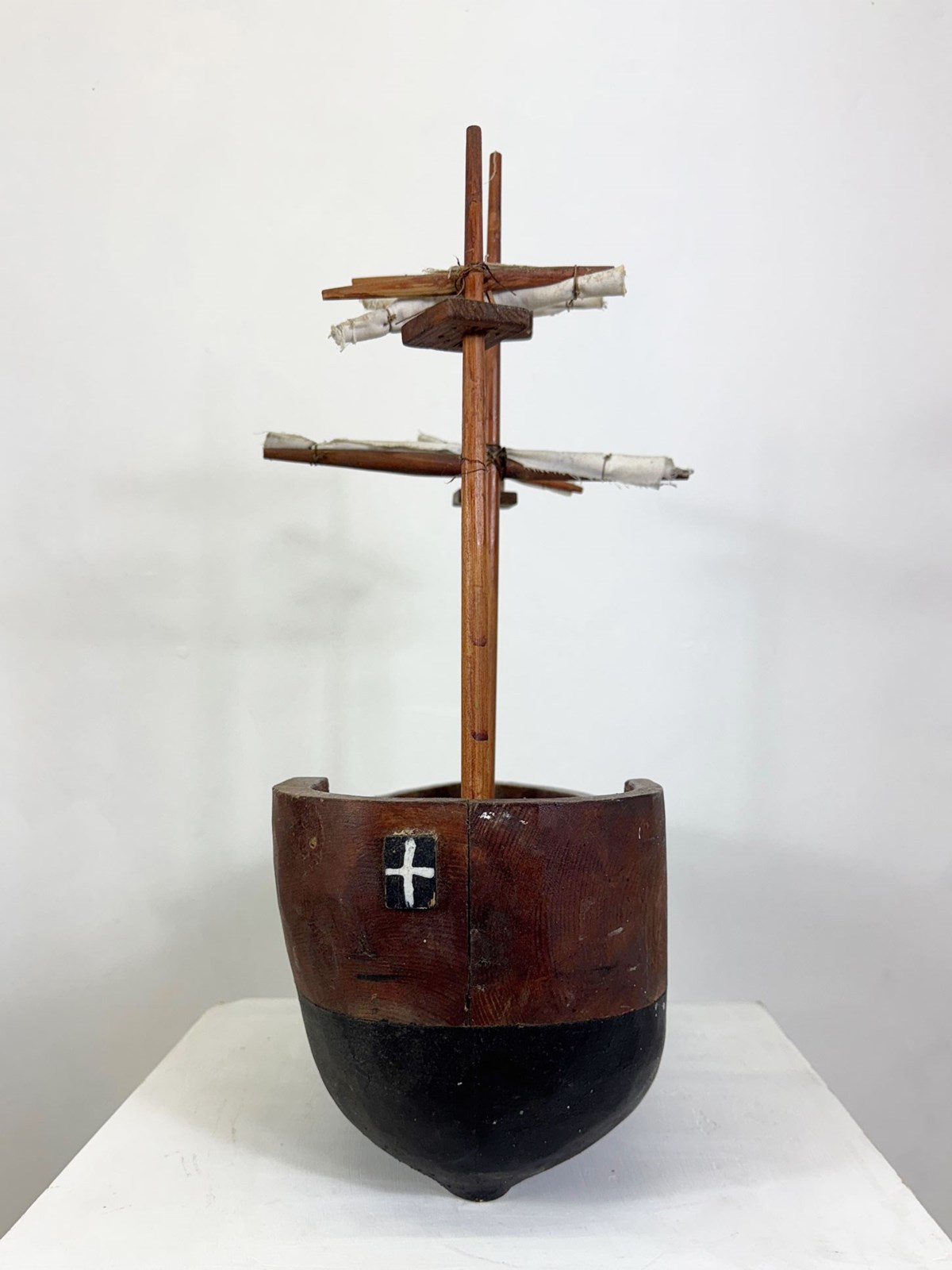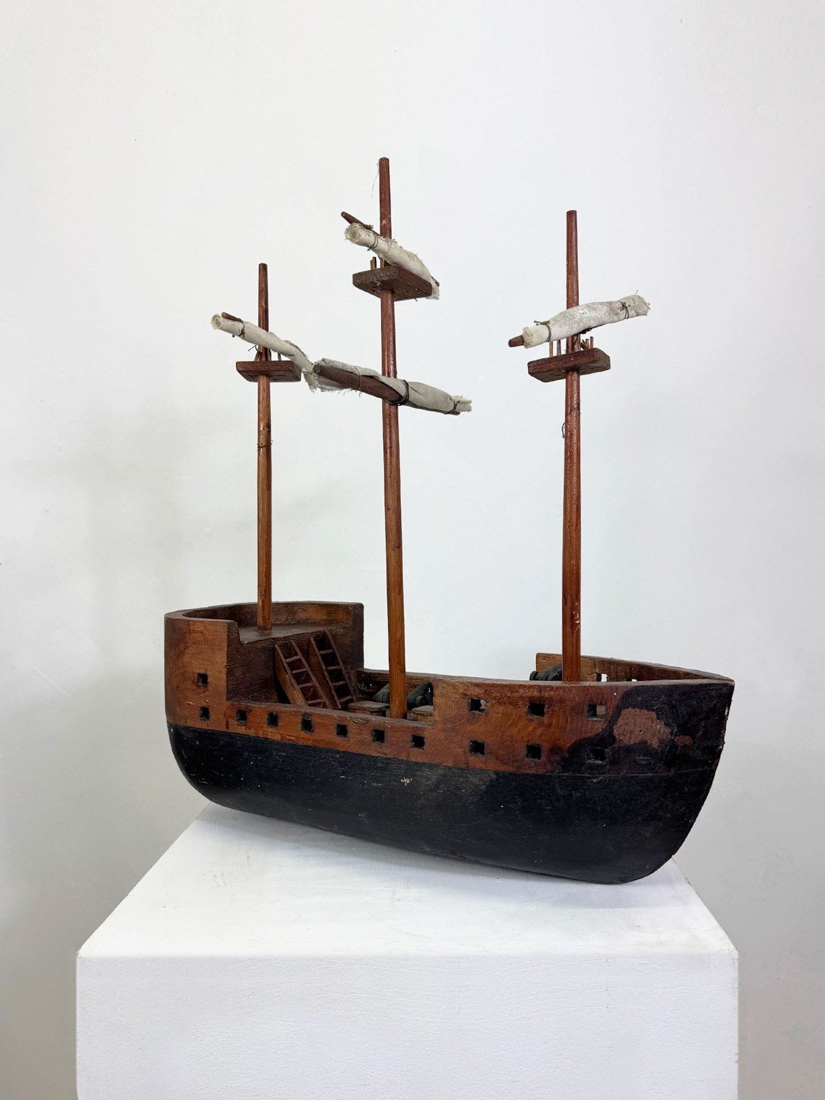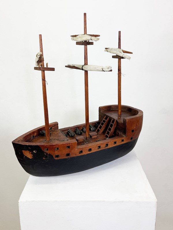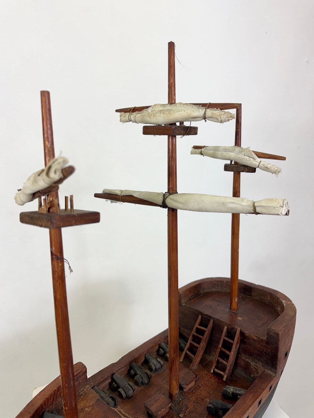 This is a scratch-built wooden galleon, handcrafted with naive detailing and a solid wood construction. Featuring three tall masts, rolled cloth sails, miniature cannons, and a high stern, this piece captures the essence of the iconic sailing galleons of the 16th–18th centuries.