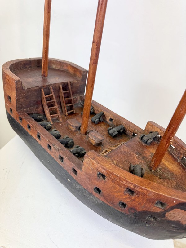 The ship has a rustic charm, with visible age and wear that highlight its handmade character. Its sturdy build and large size make it a striking display piece for collectors of nautical antiques or anyone looking to add maritime atmosphere to their home or office.