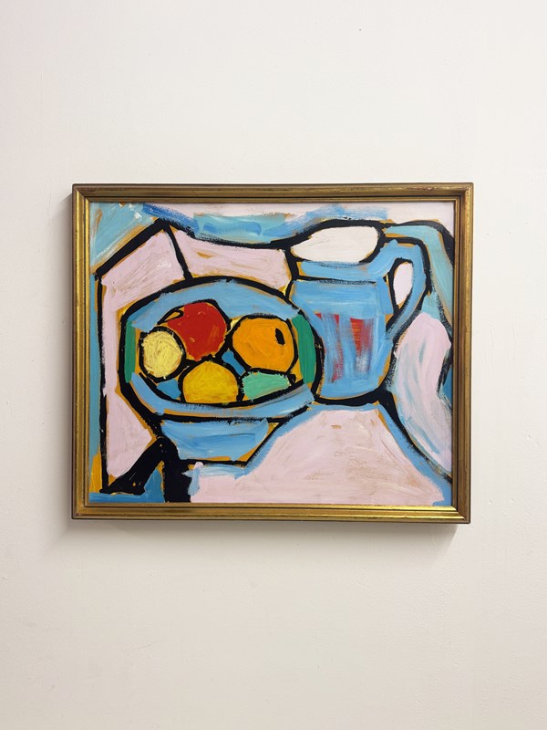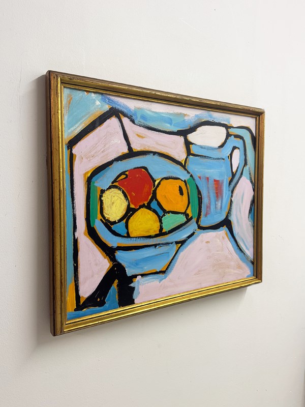 Original vintage oil painting on board depicting a vibrant still life with fruit and jug. Expressive brushwork, confident linework and rich colour give this piece a modernist, mid century feel. Set in a classic gold frame, this one-of-a-kind artwork adds warmth and character to any interior. Arrives ready to hang.