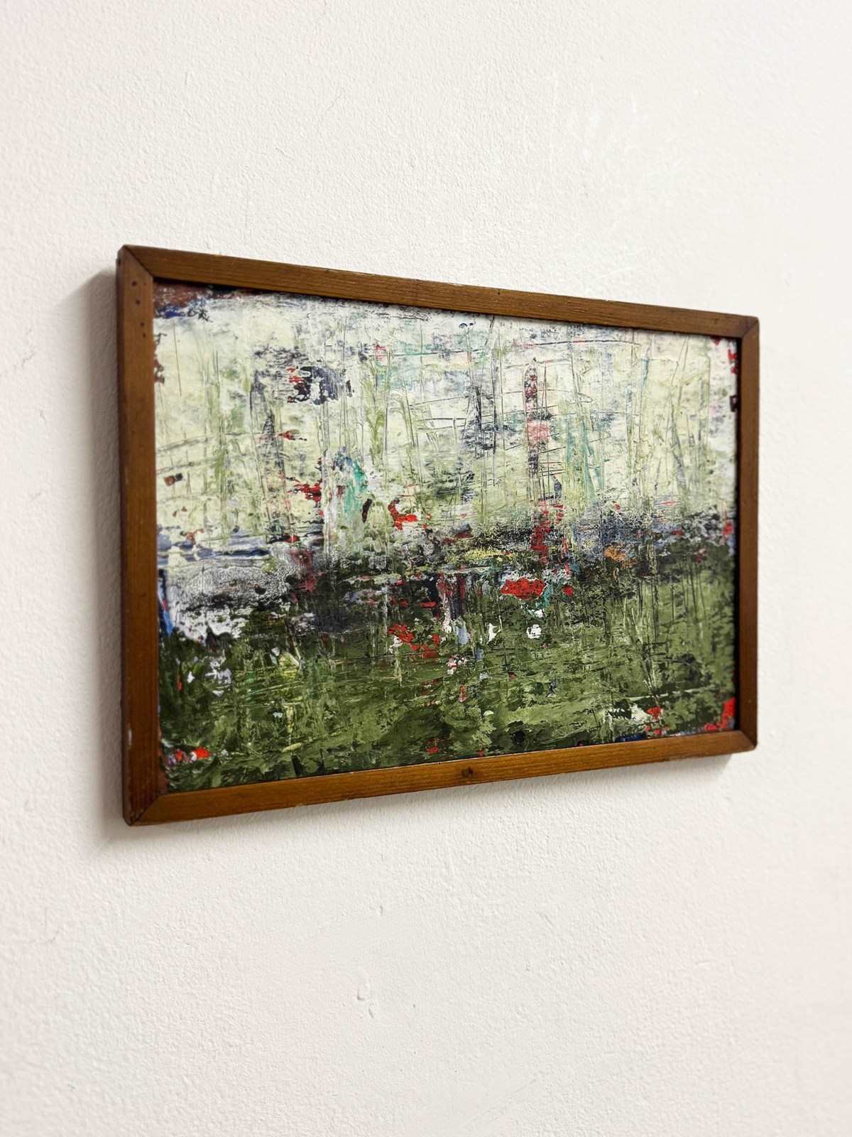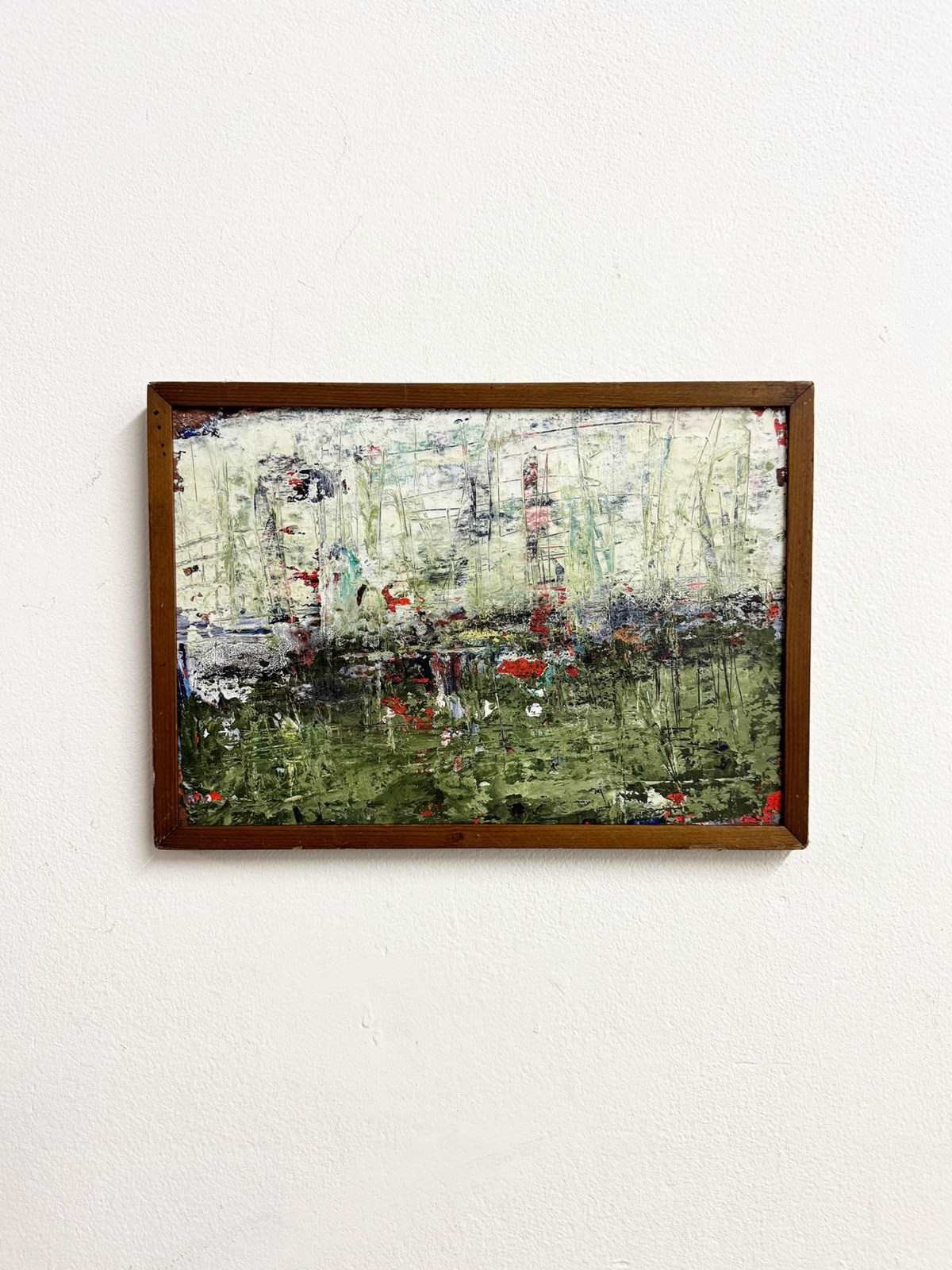 Original late 20th century abstract expressionist oil painting on canvas, featuring layered textures and expressive brushwork in green, cream and red tones. Presented in a vintage mid-century oak frame. A striking small-scale artwork ideal for contemporary interiors and collectors of abstract art.