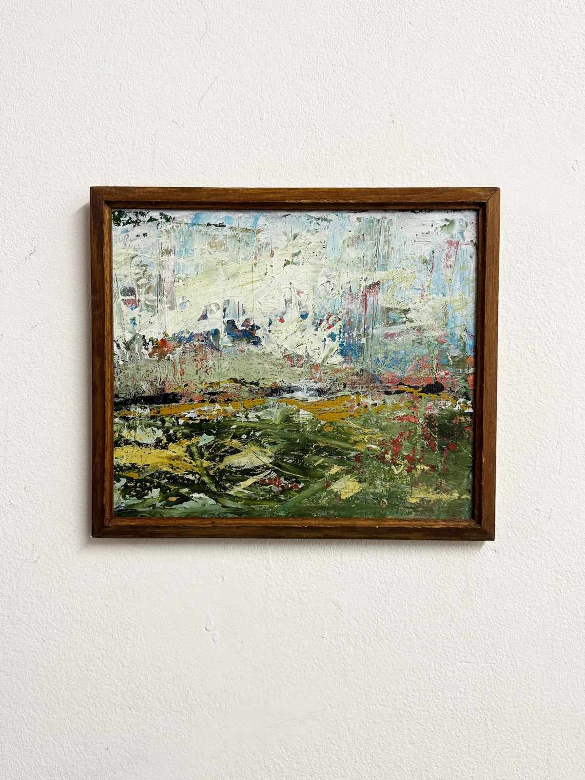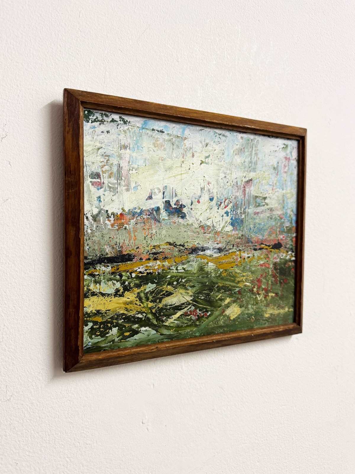 Abstract Expressionist oil painting on canvas, indistinctly signed on the reverse, dating from the late 20th century. This dynamic A small-scale composition features layered textures, expressive brushwork and a vibrant palette of greens, yellows, blues, and subtle red accents, evoking an atmospheric landscape.