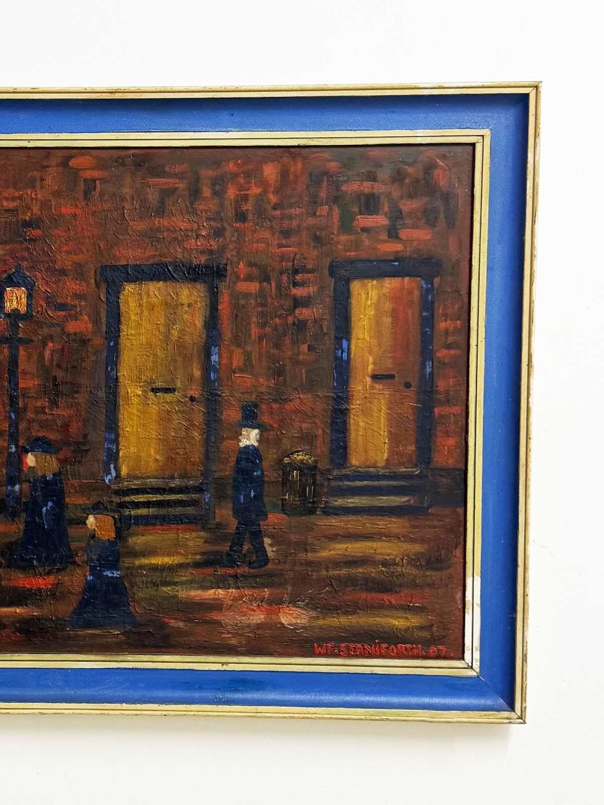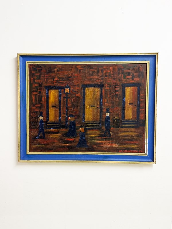A large mid 20th century oil painting depicting a quiet urban street scene with passing figures, signed and dated W. F. Staniforth ’67 to the lower right. Executed in oil, the work features richly textured brushstrokes and an earthy palette of brick reds, ochres, and deep blues. Simplified, stylised figures in period dress move past tall doorways, creating a timeless and atmospheric sense of everyday life.