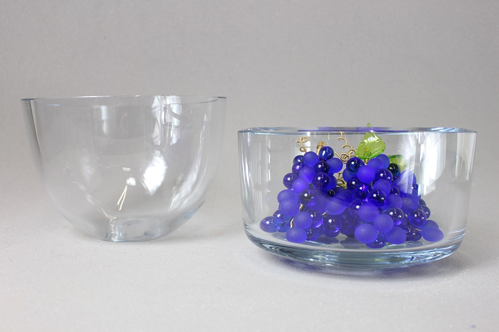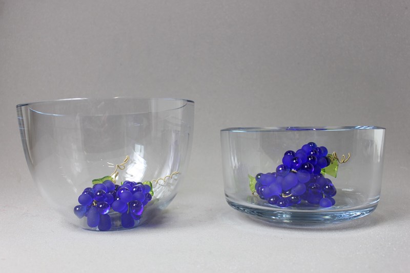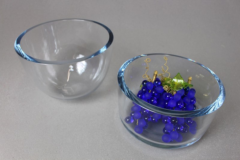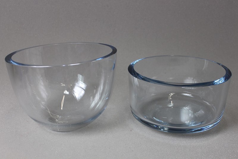 It’s unusual to find the large bowls as they won’t have sold in such numbers as the vases . Strangely the larger one is the lighter of the 2 as the glass isn’t quite as thick towards the base even though at the rims both are identical at 1cm. The larger one has perfectly flat rim, whereas the other has a slightly angled one.