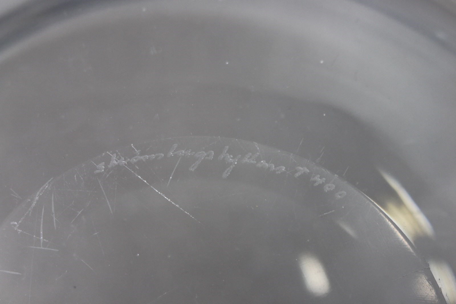 The Swedish small glassworks of Stombergshyttan was owned and run by the Stromberg family for 2 or 3 generations on and off before eventually being taken over with others in 1976. They specialised in thick walled heavy crystal vases and bowls with polished edges with the first designs being created by Gerda Stromberg in 1933. Eric’s widow Asta is usually given as the designer of these later versions produced in the late 1950’s and into the 1960’s.