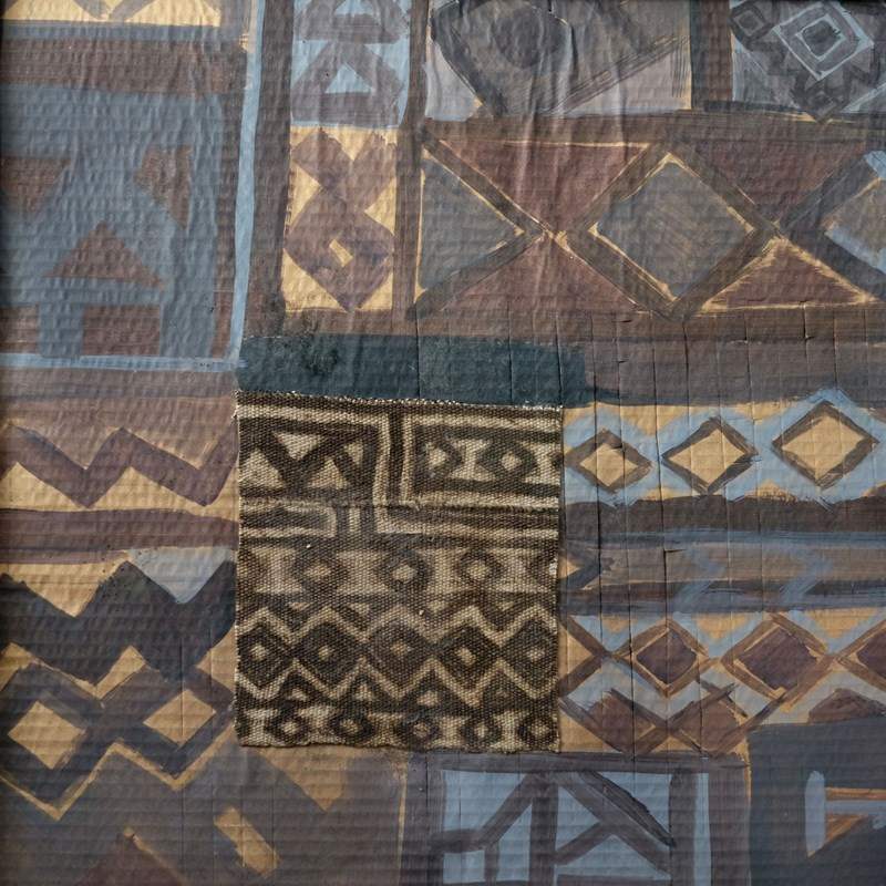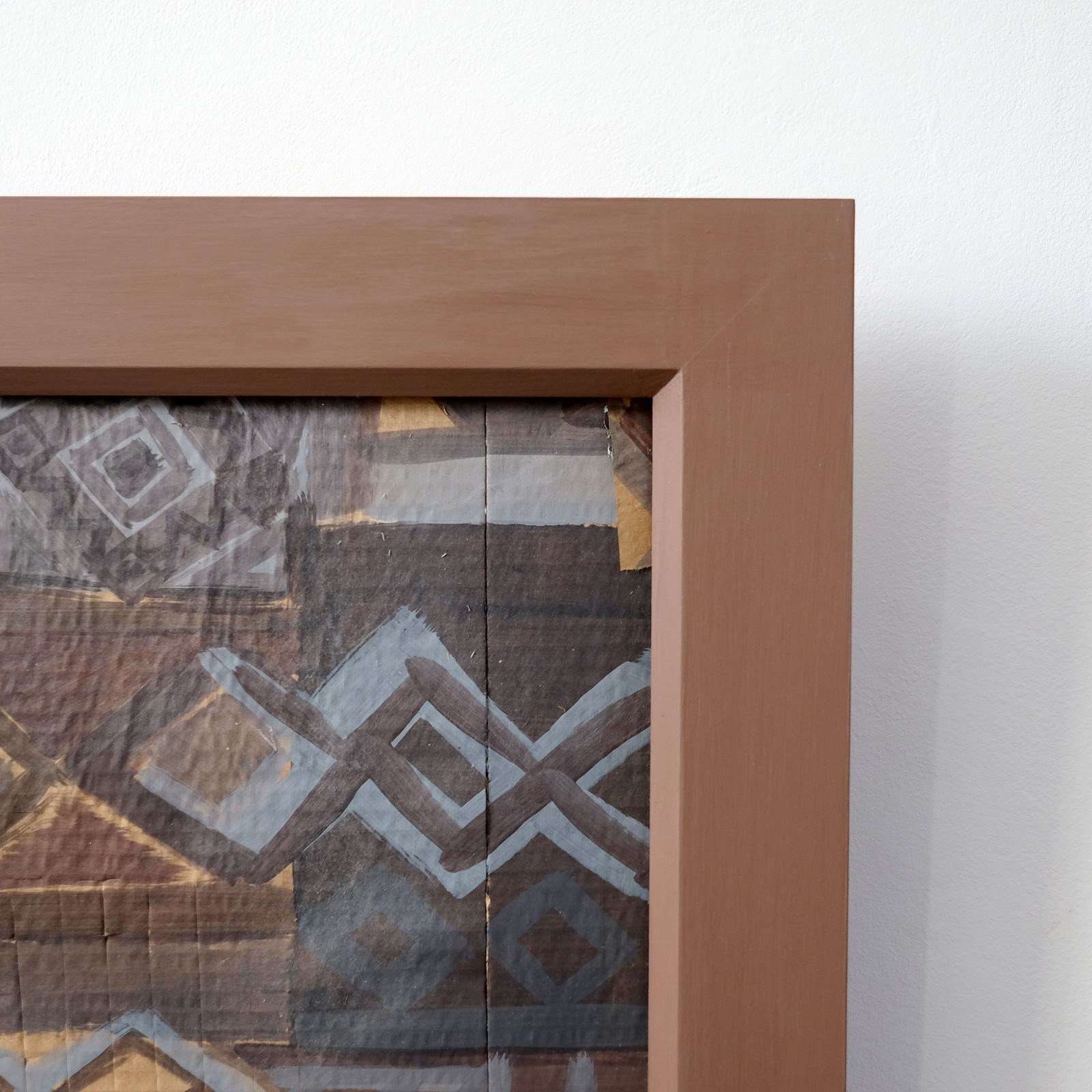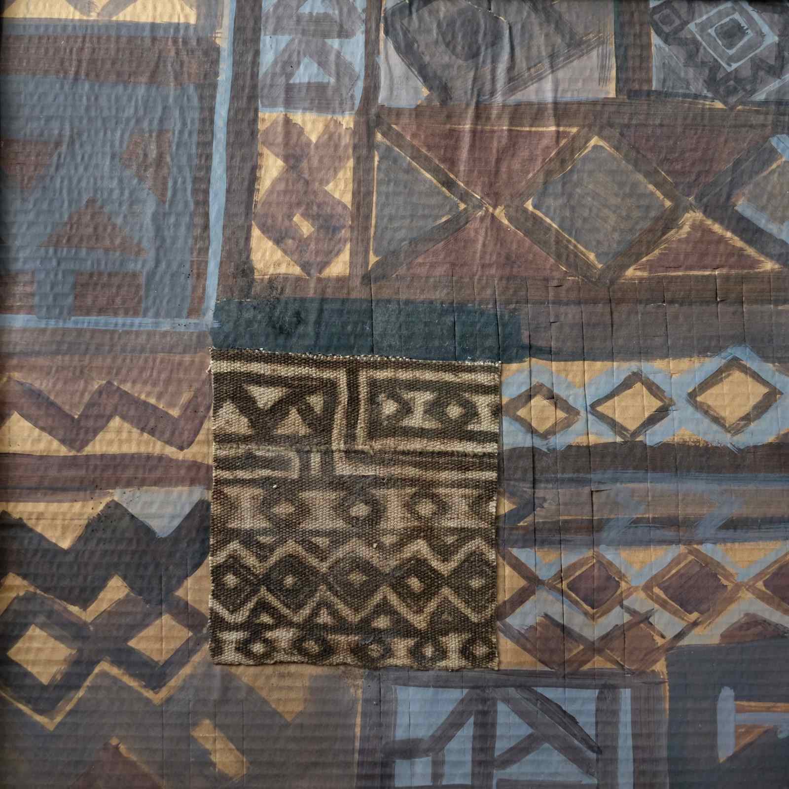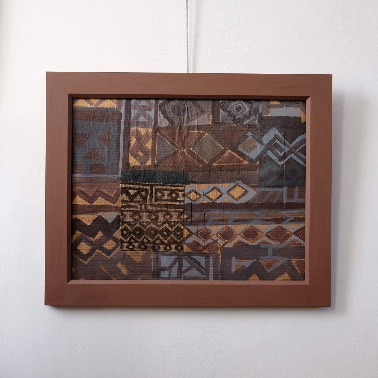 Mid 20th century abstract compositon on card. The artist has taken inspiration from the square section of mud cloth and continued this throughout the piece with great earthy tones. Contemporary frame. Artist unknown but sourced in France.