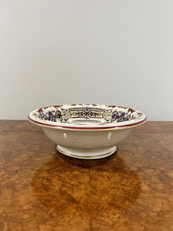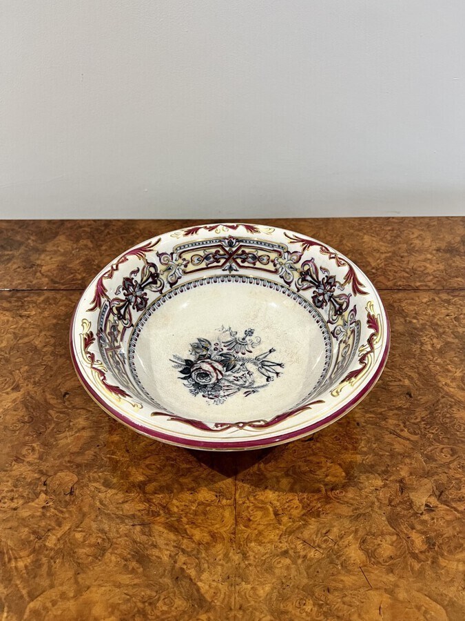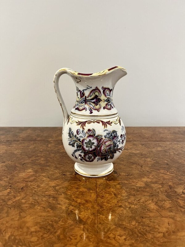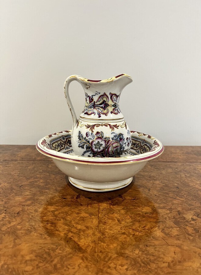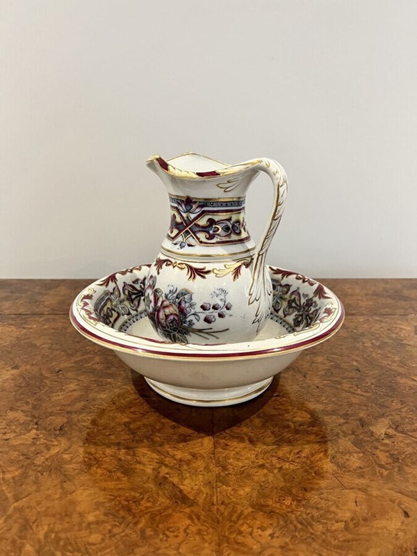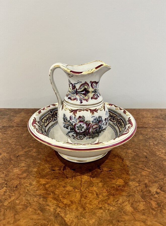 Victorian miniature jug and bowl set having a lovely unusual quality antique Victorian jug and bowl set with floral detail in wonderful red, gold, yellow and blue colours.
