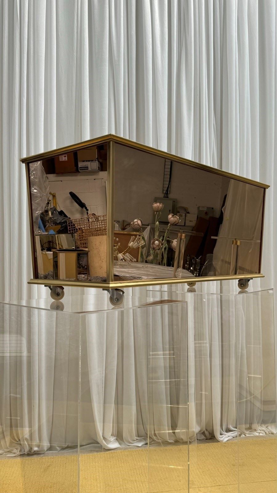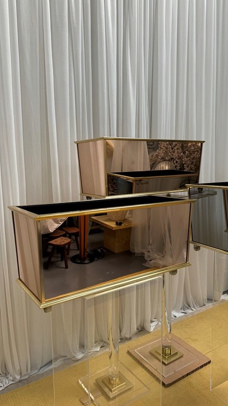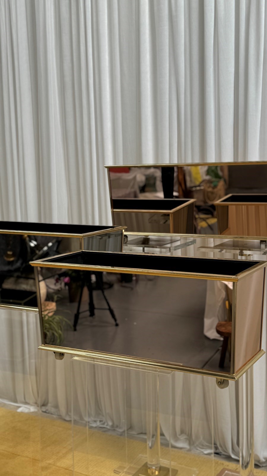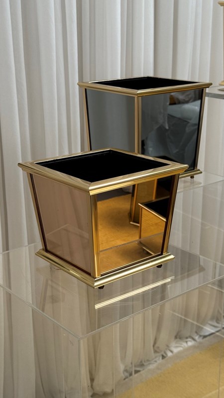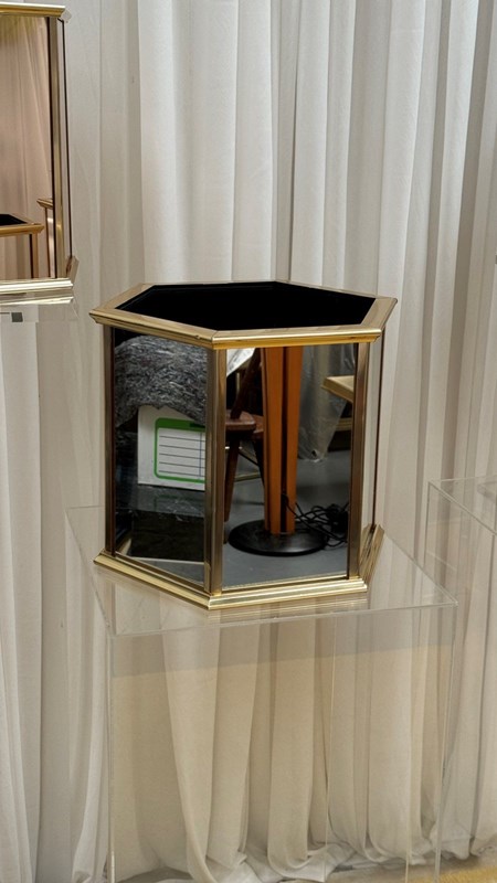 They come in various shapes, (rectangular, square and octagonal) and sizes in plain, rose and smoke tinted mirror plate with a gold metal trim with castors, feet or flat bases. Circa 1980s, Belgium.