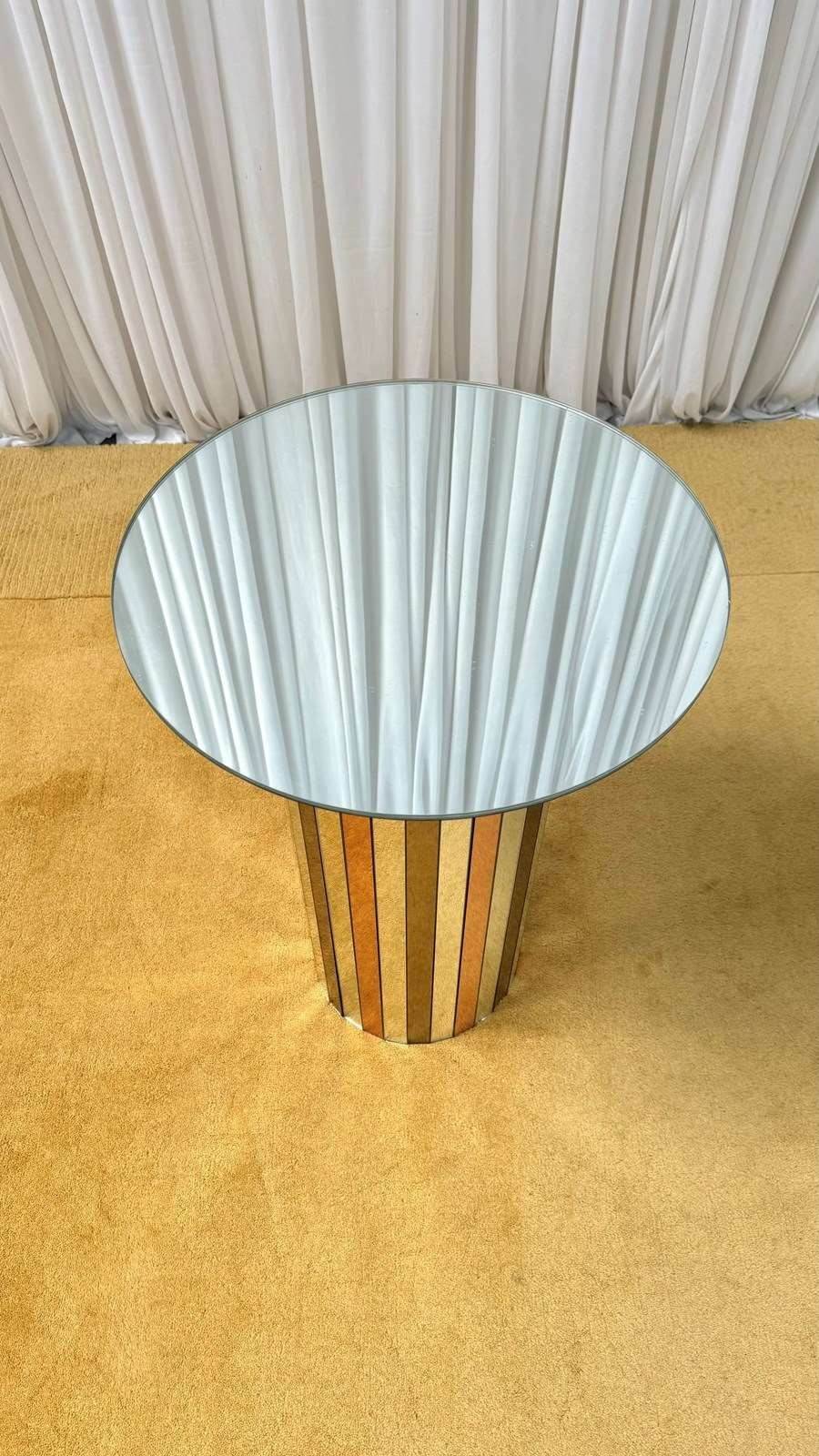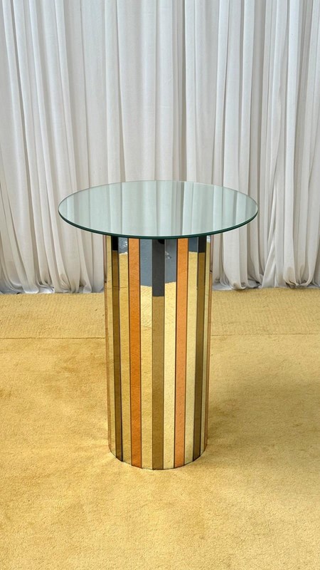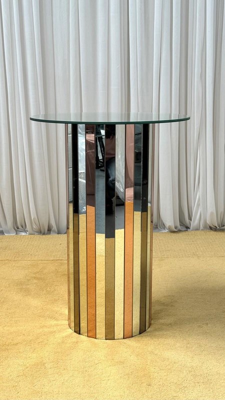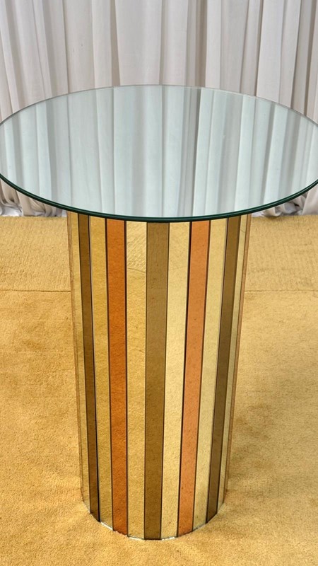 Occasional/side table by Willy Rizzo, with faceted smoked, rose and plain tinted mirrored glass surrounding a column base.