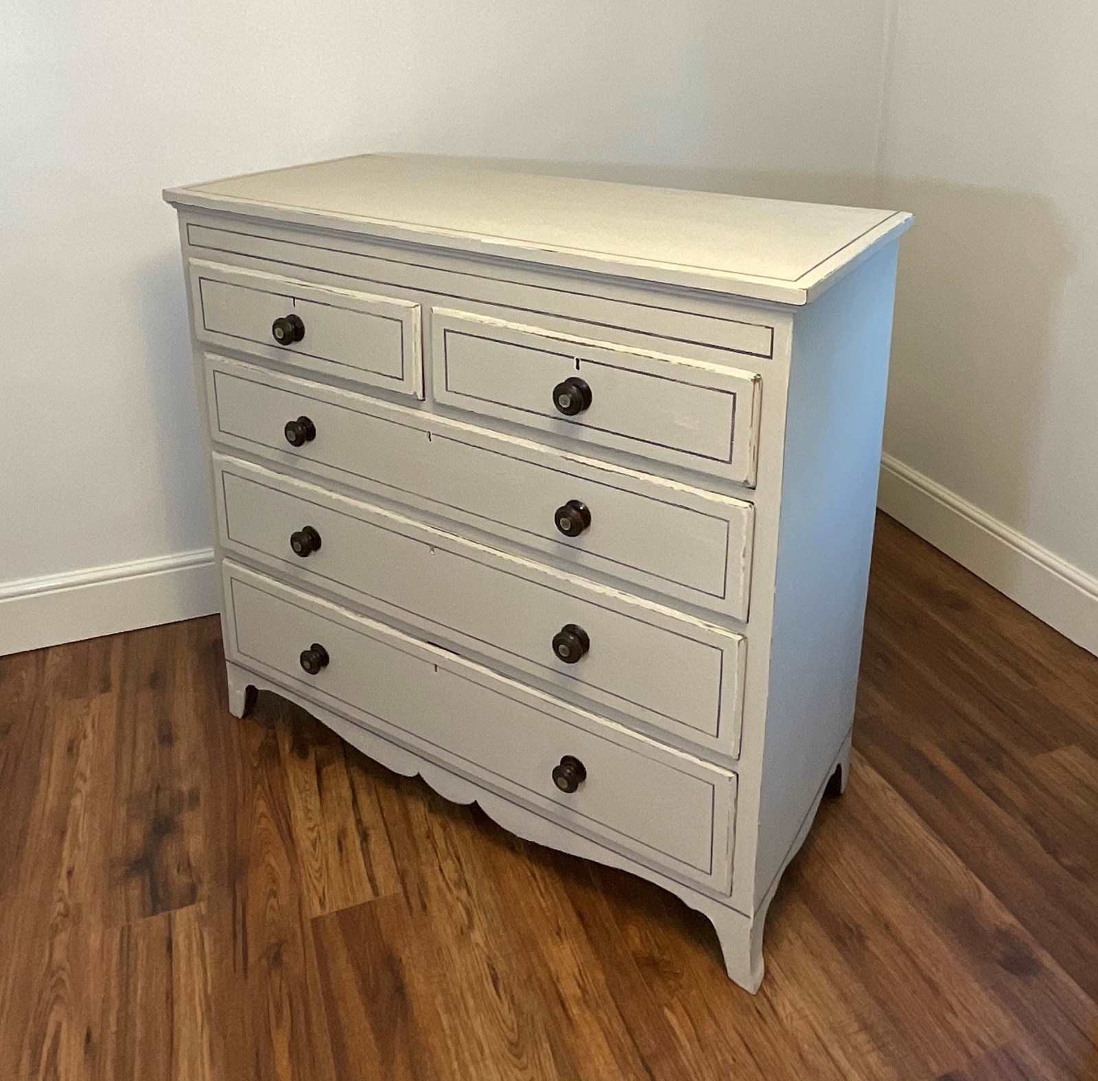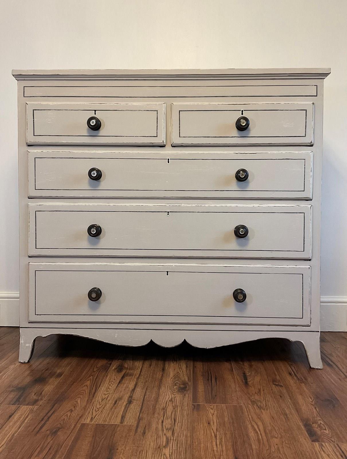 An early Victorian chest of drawers with a distressed light grey paint finish and line detail.