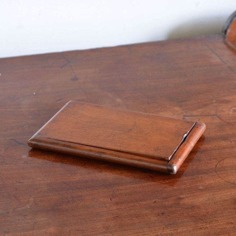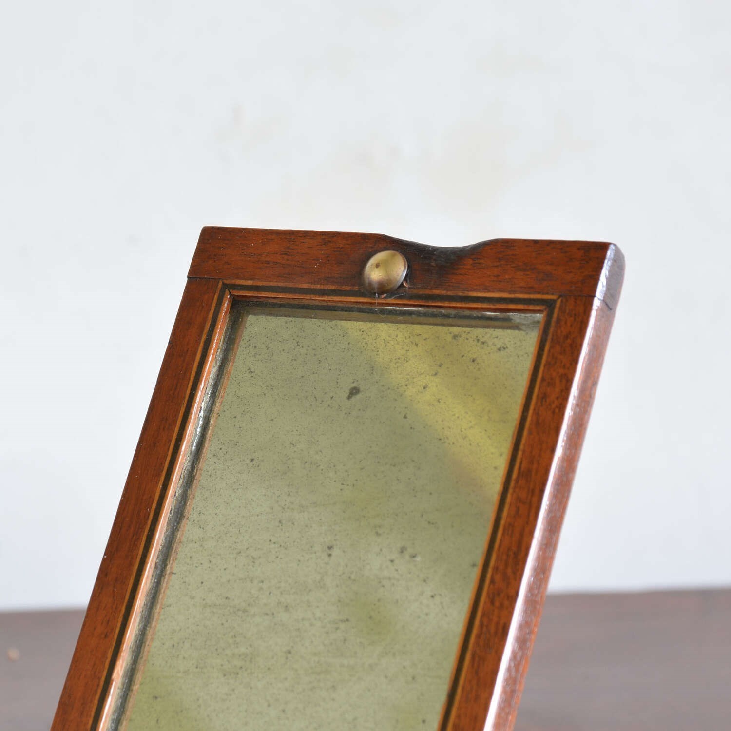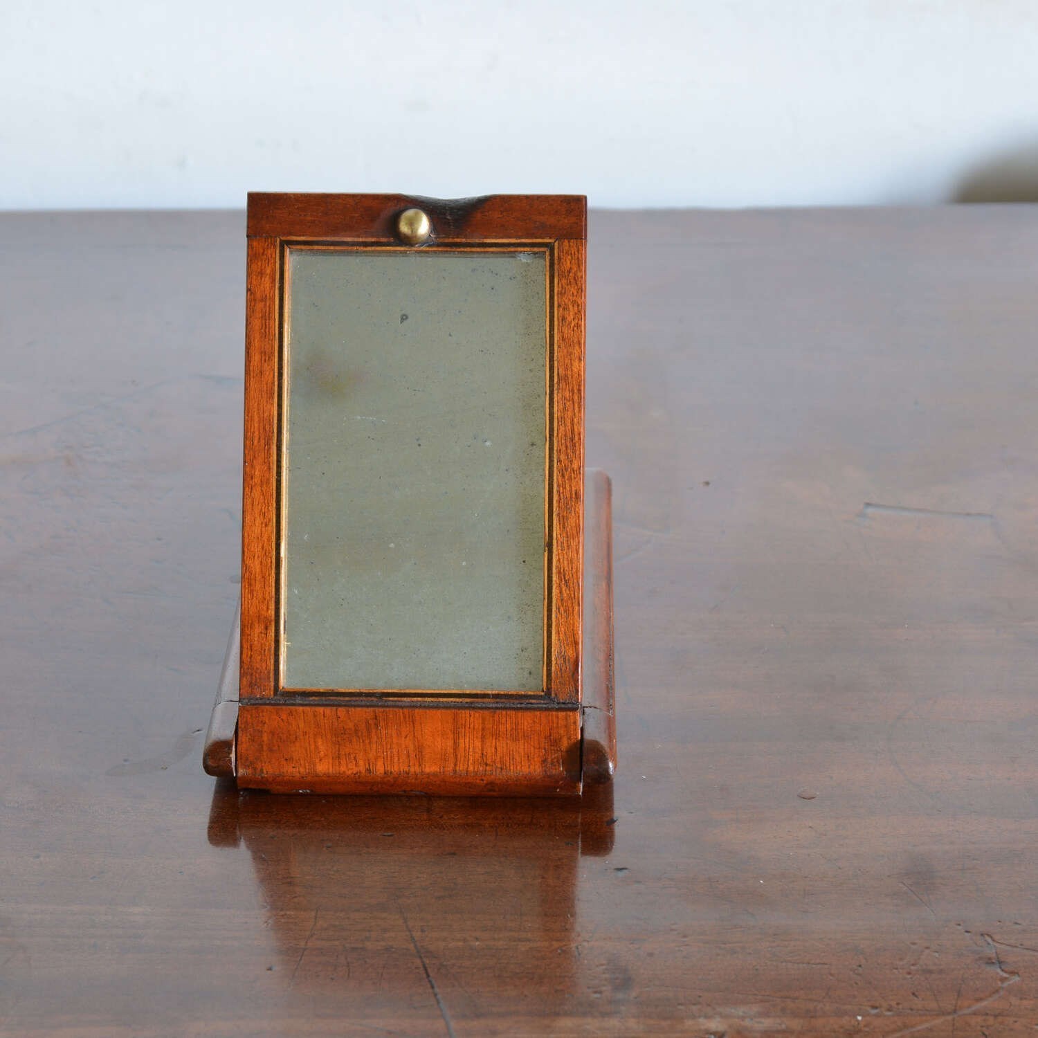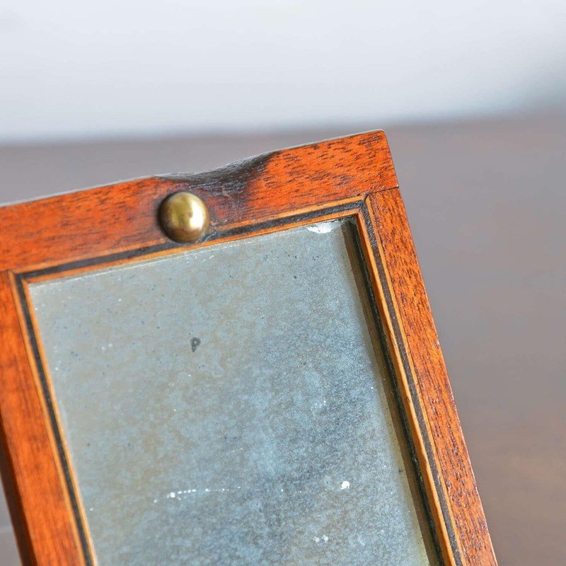 The rectangular case opens to a rectangular shaving mirror with ebony and boxwood stringing and a brass stud that locates into a hole when closed, the hole can be used to hang the mirror - there is a burn mark to the frame edge which no doubt occurred when it was being used on campaign to shave by candlelight and the flame scorched the frame edge. The frame folding out to form an easel and closes to protect the looking glass.