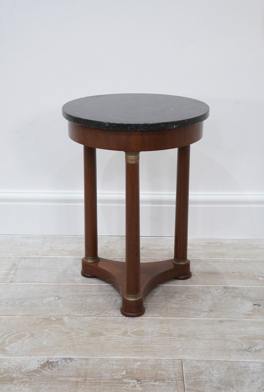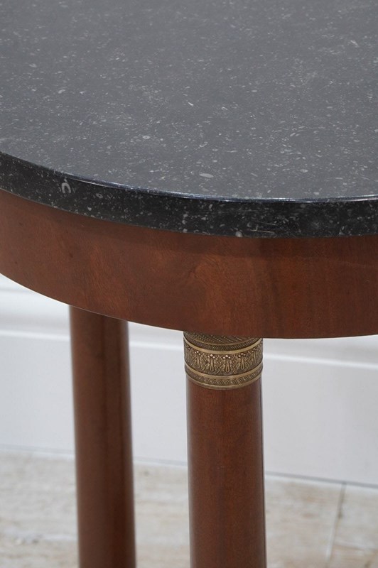 The small charcoal grey marble top is flecked with white markings. It sits upon three cylindrical legs each one embellished with patinated brass capitals. Its petite size makes it perfectly suitable for use as a small “next to the sofa table”.