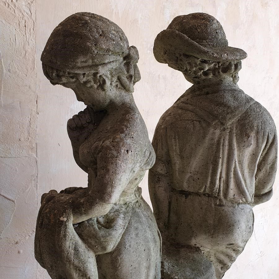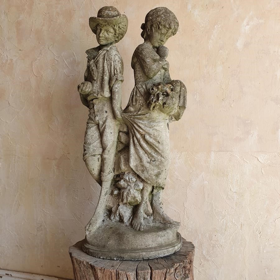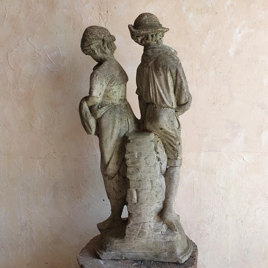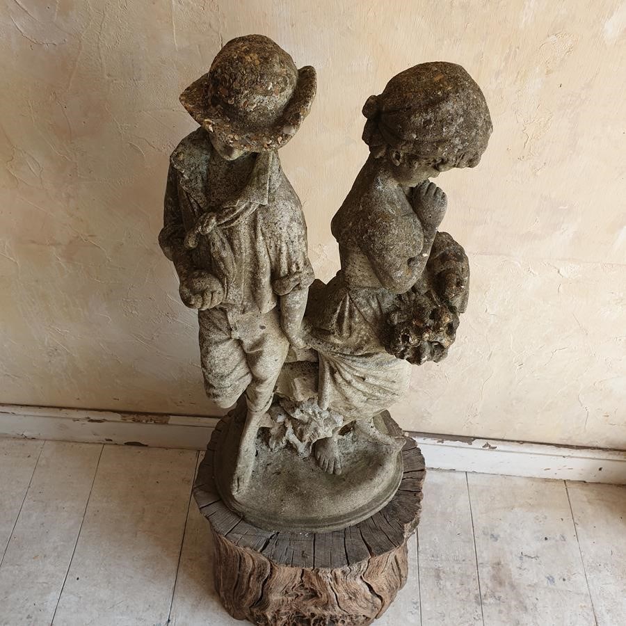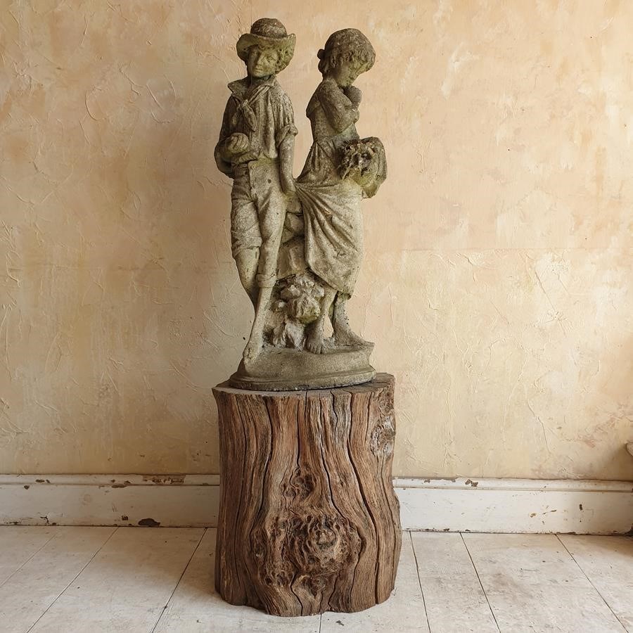 A stone composition statue of young lovers, she is holding a basket of flowers and he an apple. Now standing on a burr oak butt. Circa 1950s.