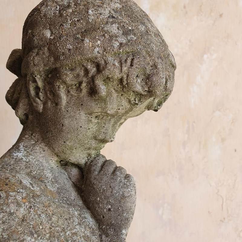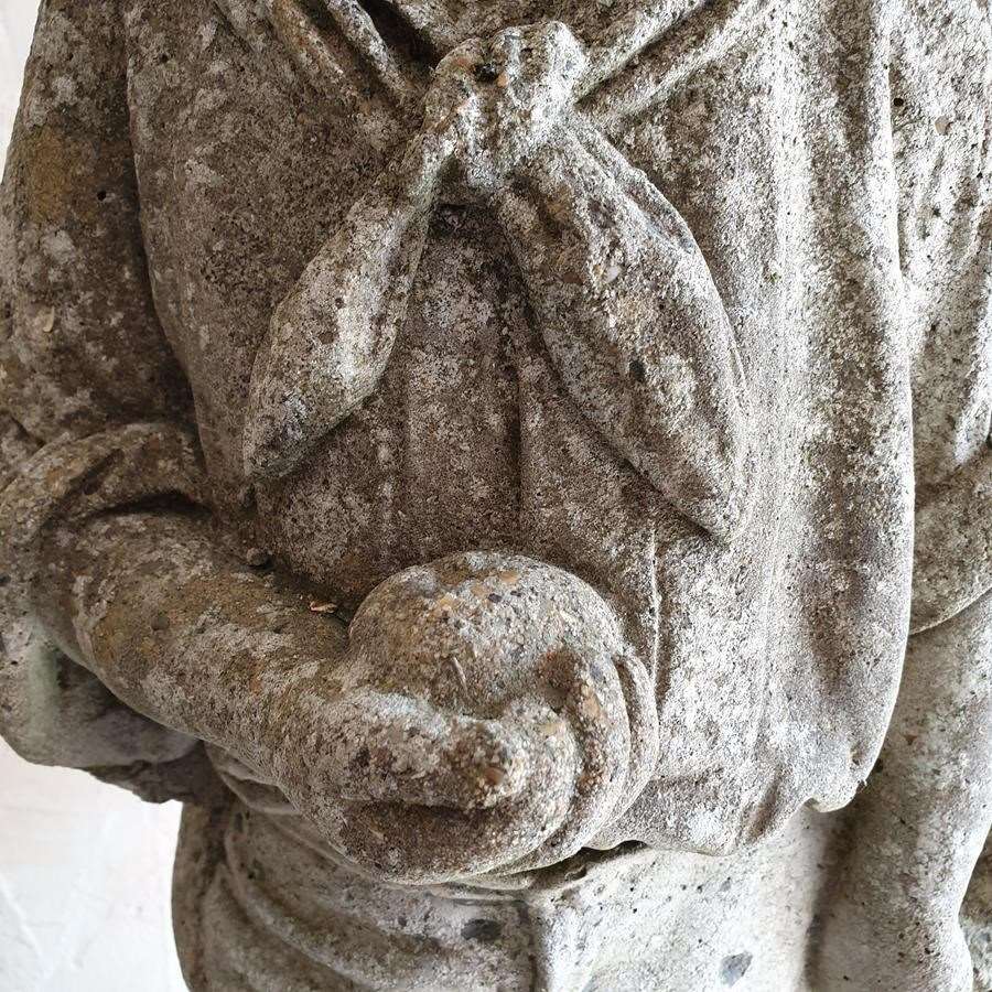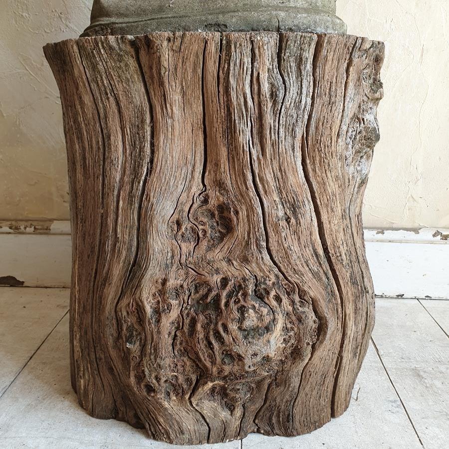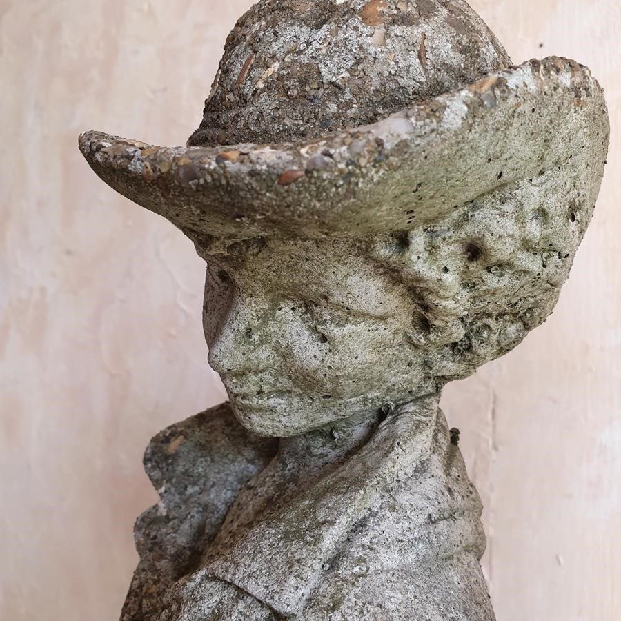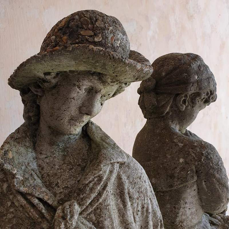 A stone composition statue of young lovers, she is holding a basket of flowers and he an apple. Now standing on a burr oak butt. Circa 1950s.