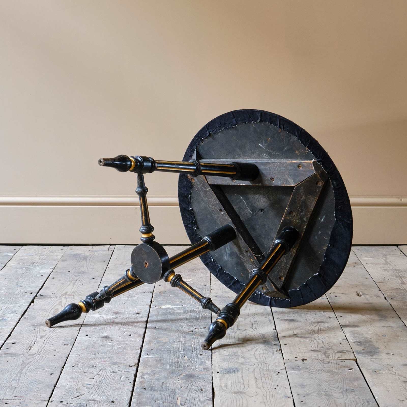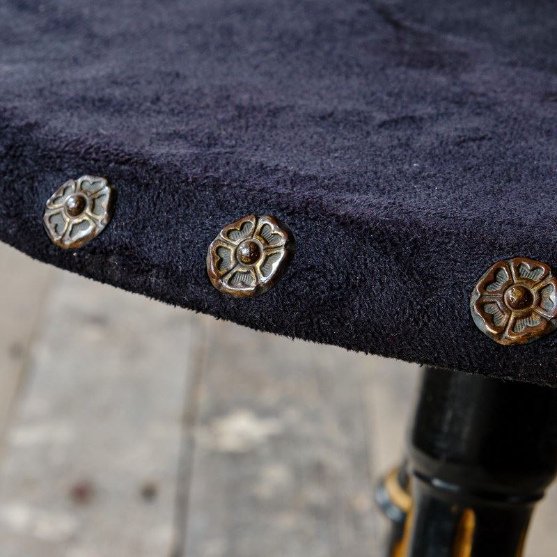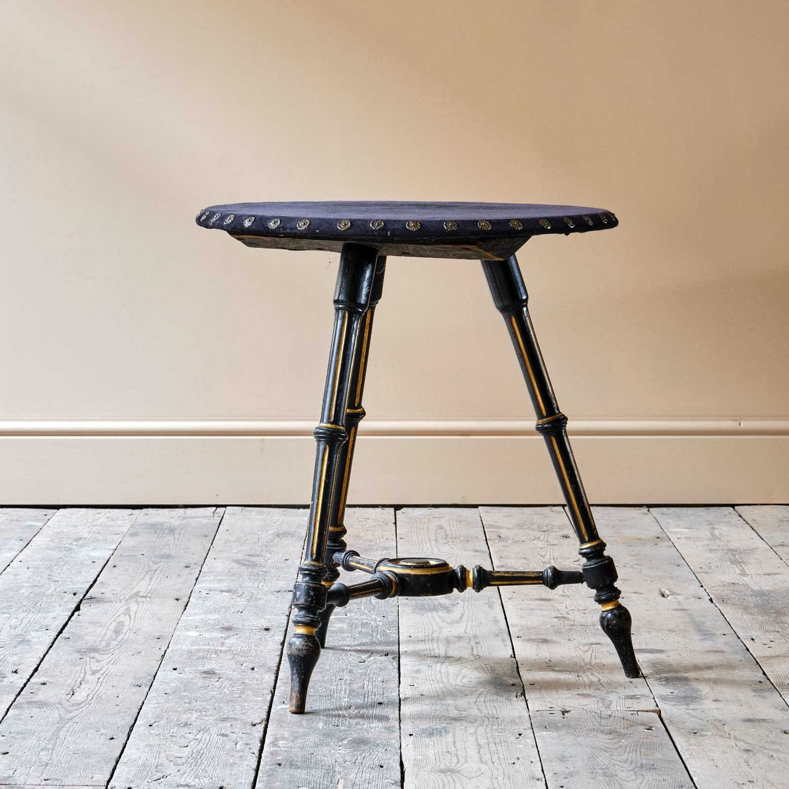 A 19th century Aesthetic Movement side table. The ebonized and gilt base with a velvet top and antique studs. English c1870