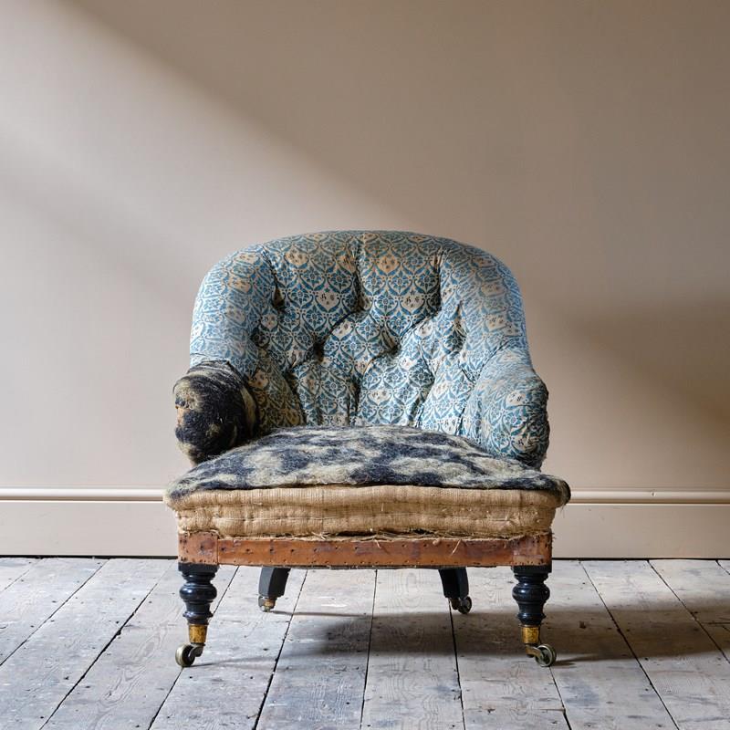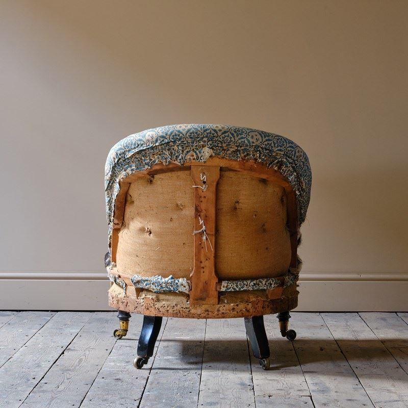 A mid 19th century deep seated tub back armchair by Howard and Sons, London - England c1860. Raised on ebonized walnut legs and the original Cope & Collinson brass casters. Retaining its original horsehair buttoned back and arms with the original Howard cotton lining.