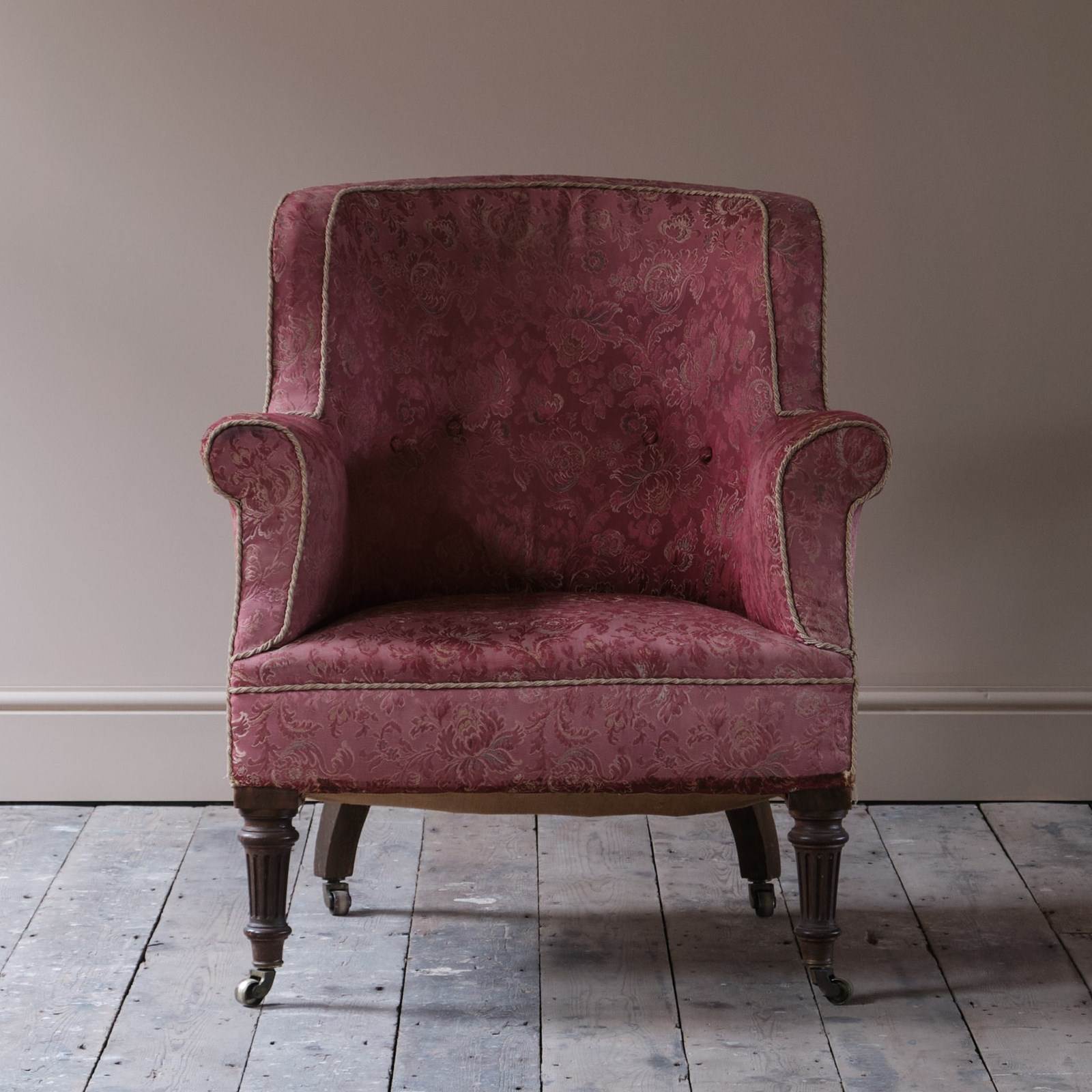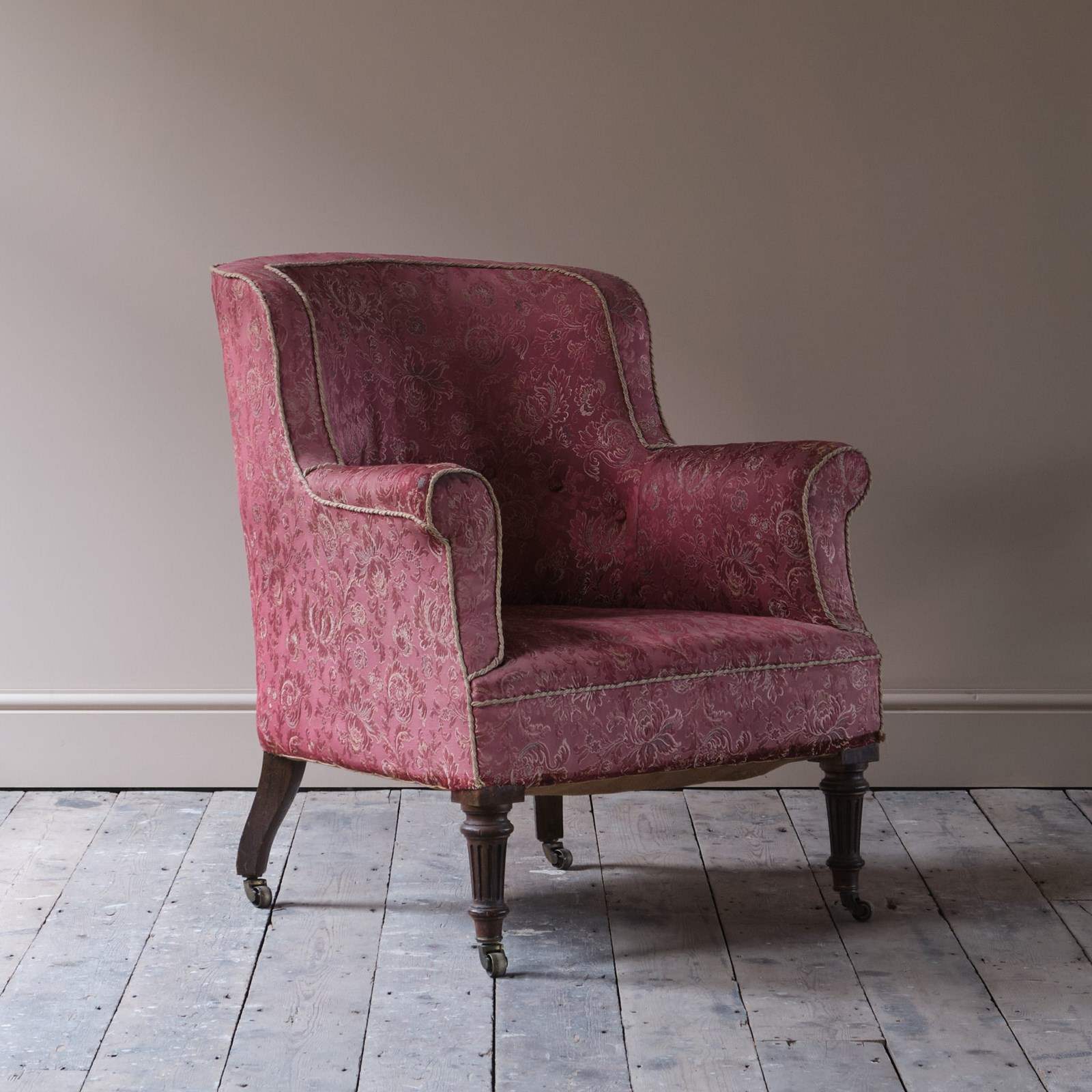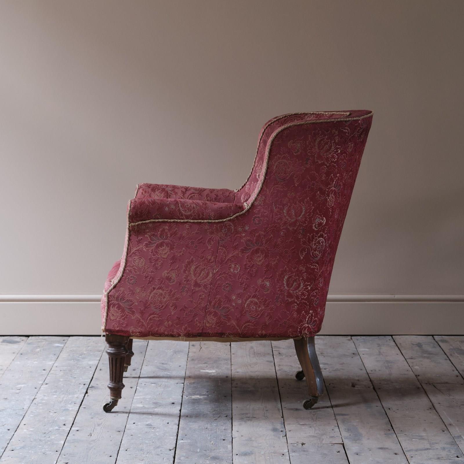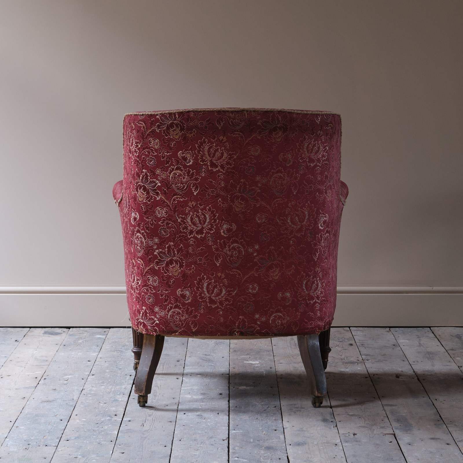 A shapely late 19th century country house barrel back armchair. Raised on turned and fluted front legs and splayed rear legs all retaining the original casters. An unusual model with a low back. English c1880