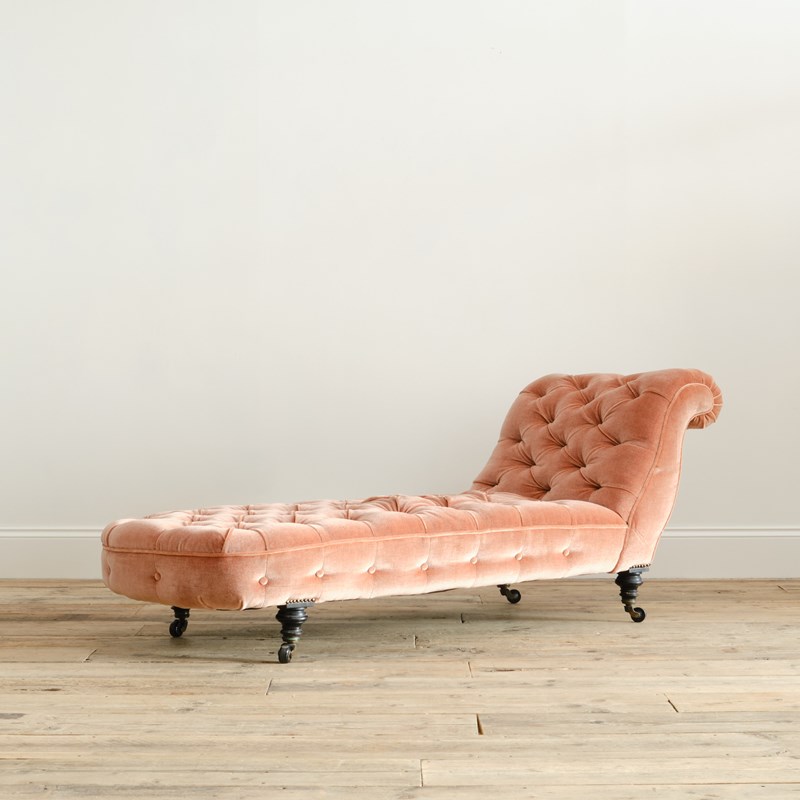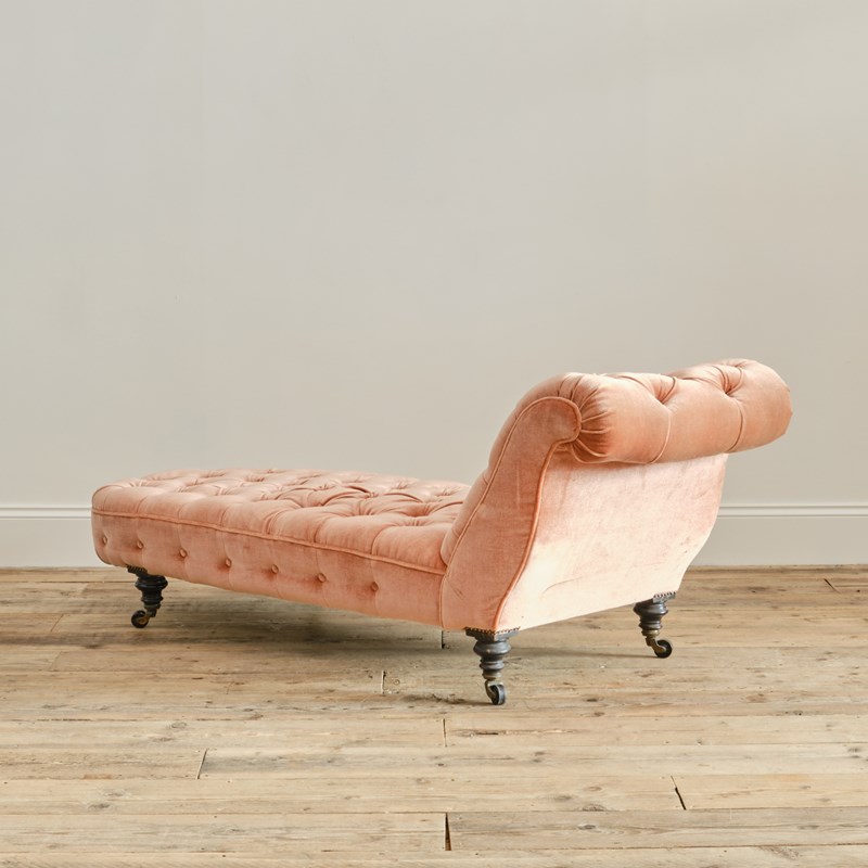 The current pink draylon velvet upholstery is lacking a few buttons on the middle of the seat.
