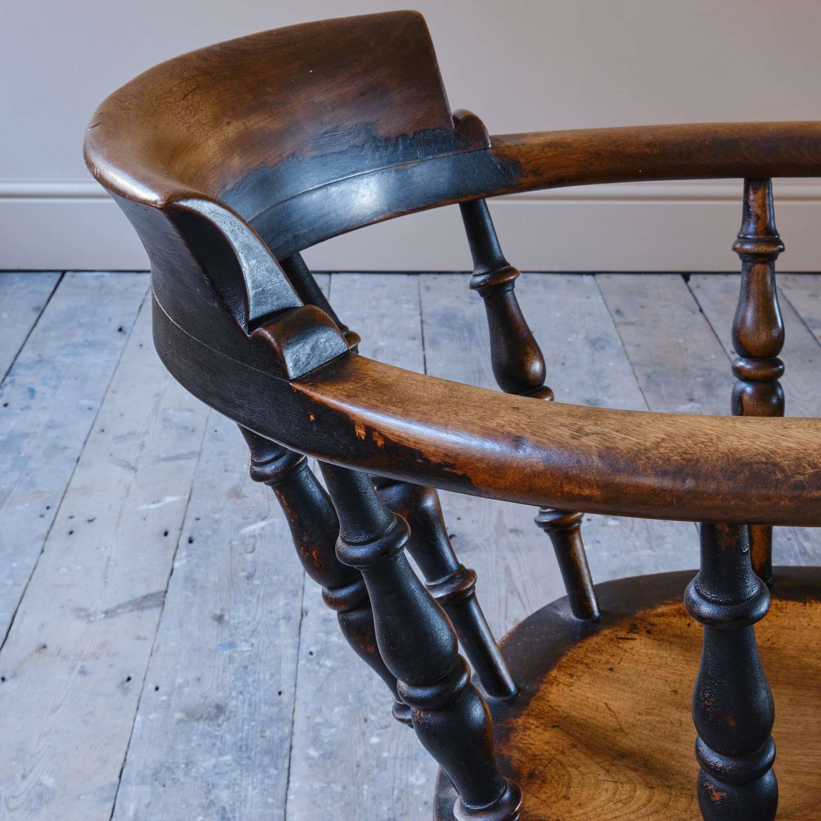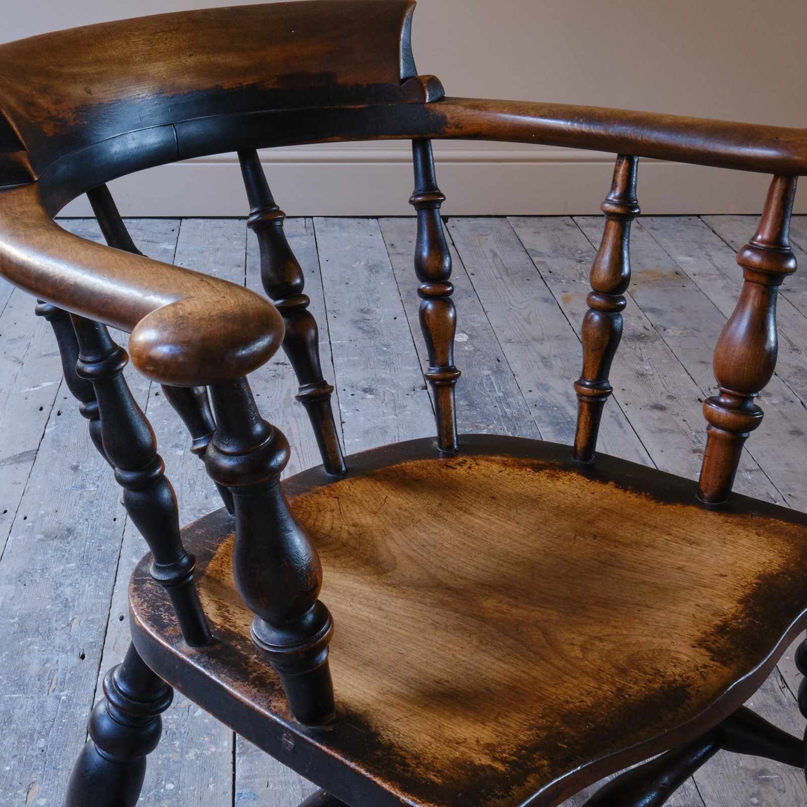 A 19th century ash and elm Windsor chair in its original crusty paint perfectly worn to reveal the timbers below. In very good original untouched condition. Bearing the makers stamp to the rear of the seat.