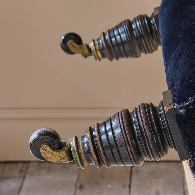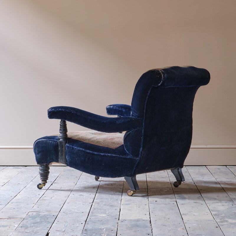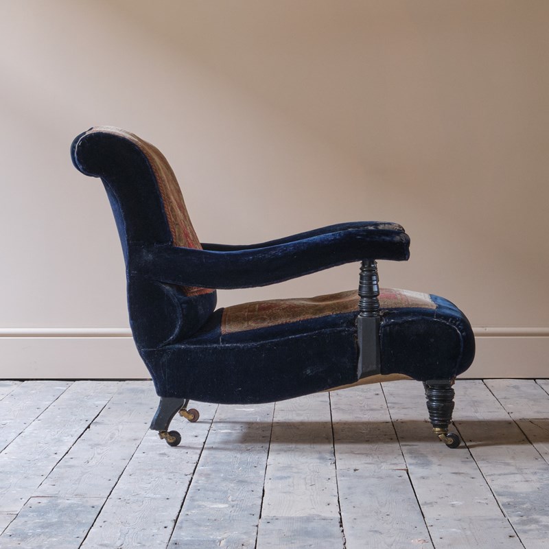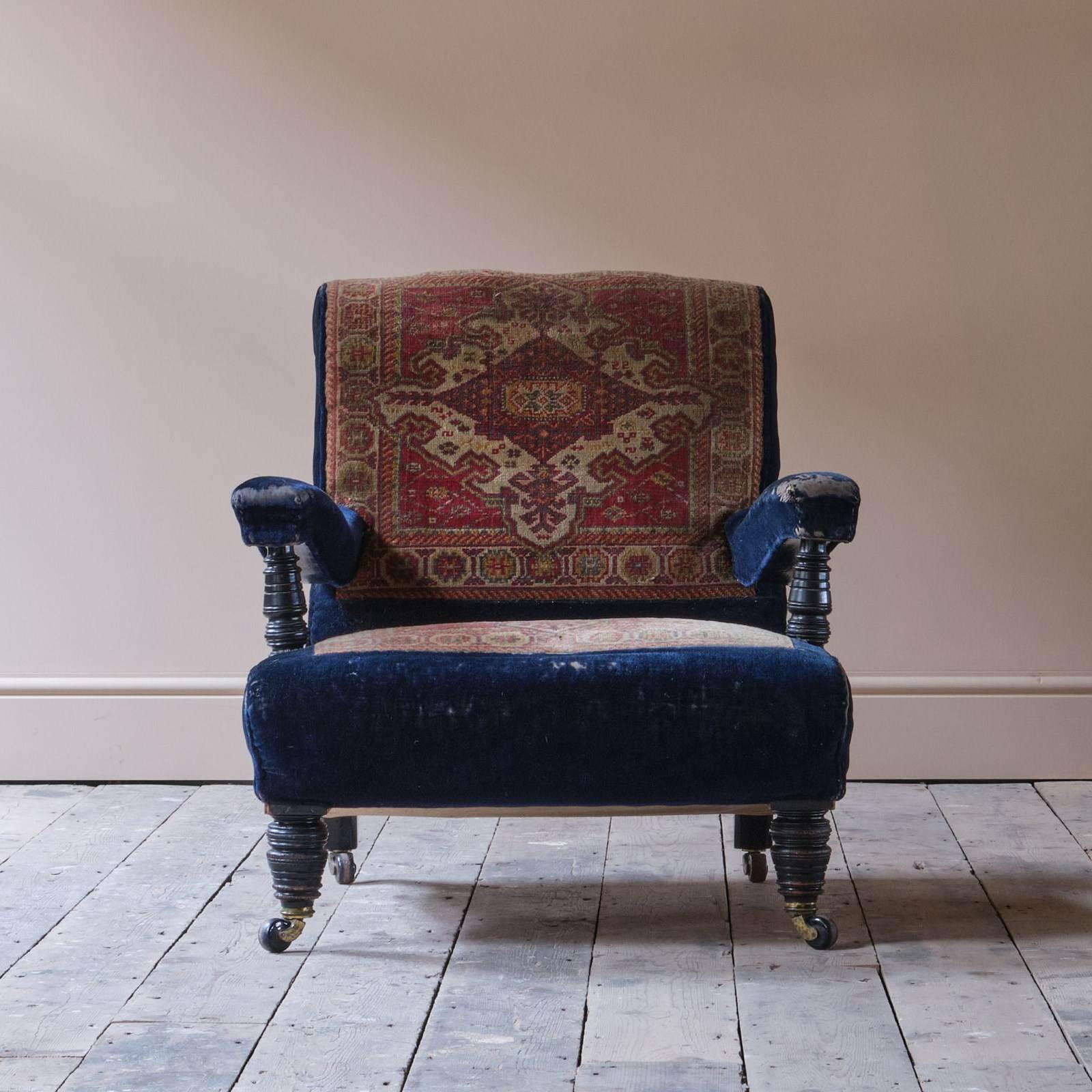 A well drawn 19th century open armchair by Cornelius V Smith in tatty country house condition. Raised on ebonized front legs and arm supports, with splayed rear legs and the left rear leg bearing the CVS makers mark. The chair stands firm and the frame is tight with n o loose joints. The original velvet and carpet both showing signs of wear particularly around the front of the seat and arms. c1885