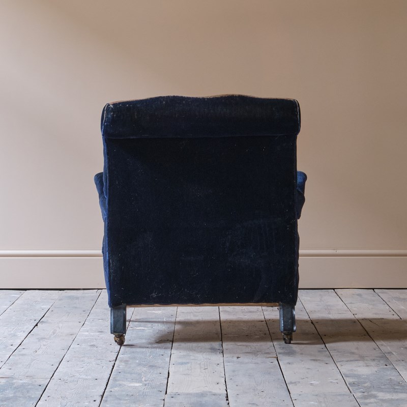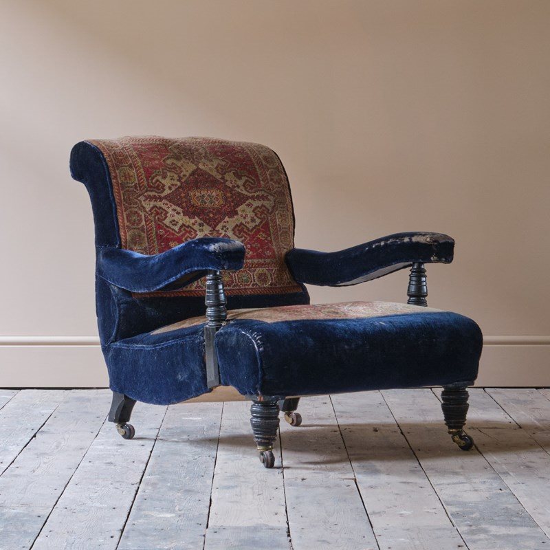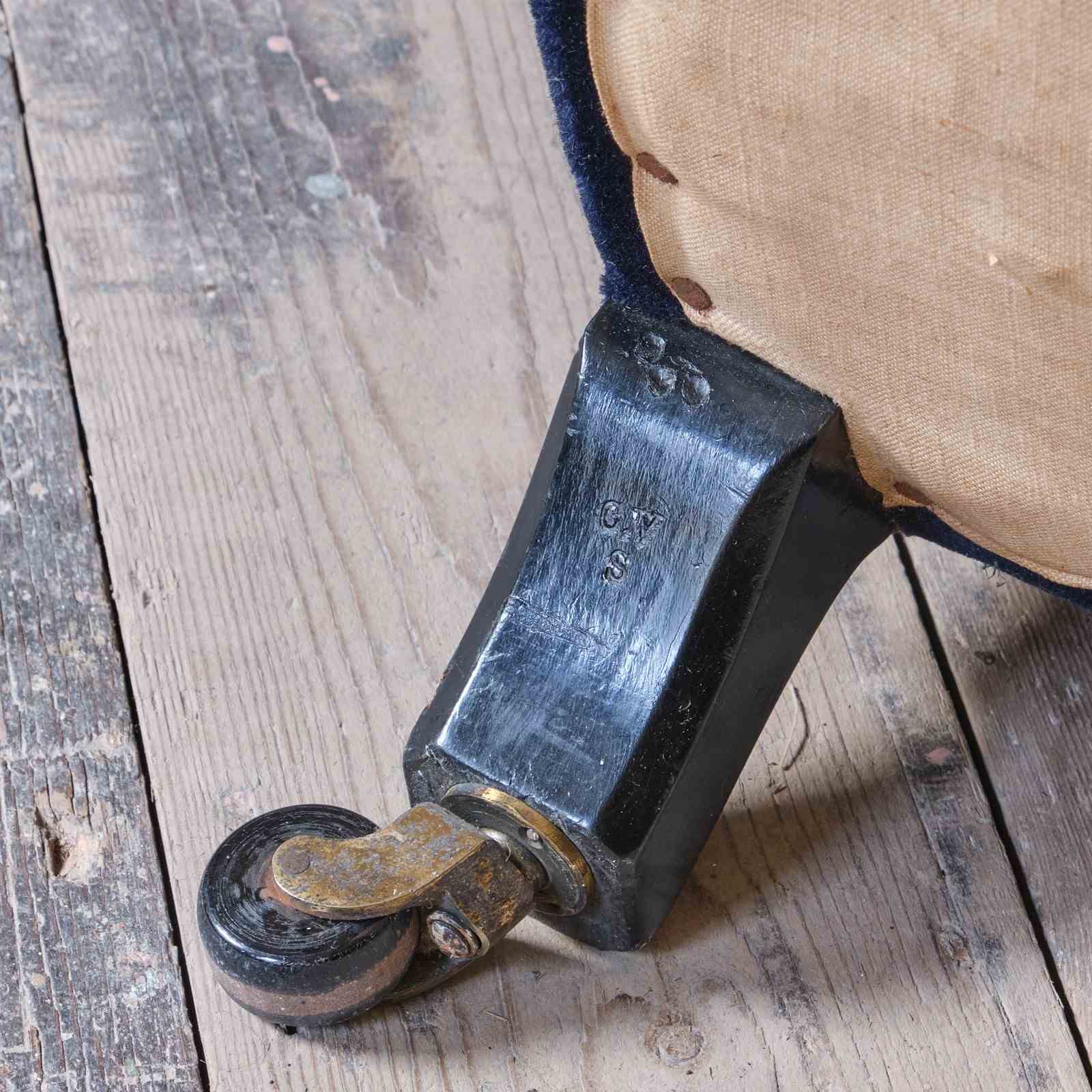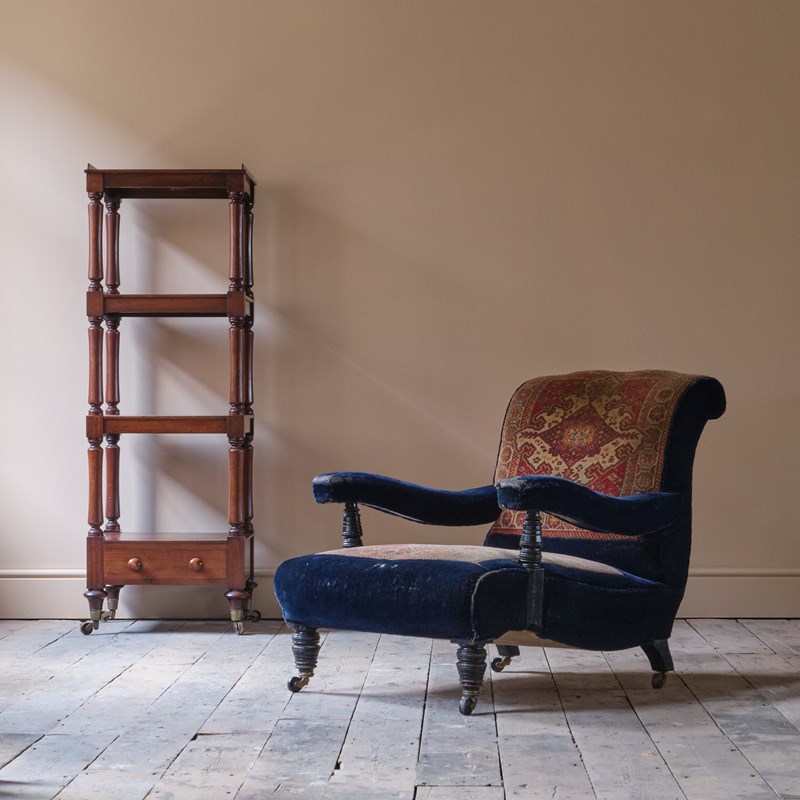 A well drawn 19th century open armchair by Cornelius V Smith in tatty country house condition. Raised on ebonized front legs and arm supports, with splayed rear legs and the left rear leg bearing the CVS makers mark. The chair stands firm and the frame is tight with n o loose joints. The original velvet and carpet both showing signs of wear particularly around the front of the seat and arms. c1885