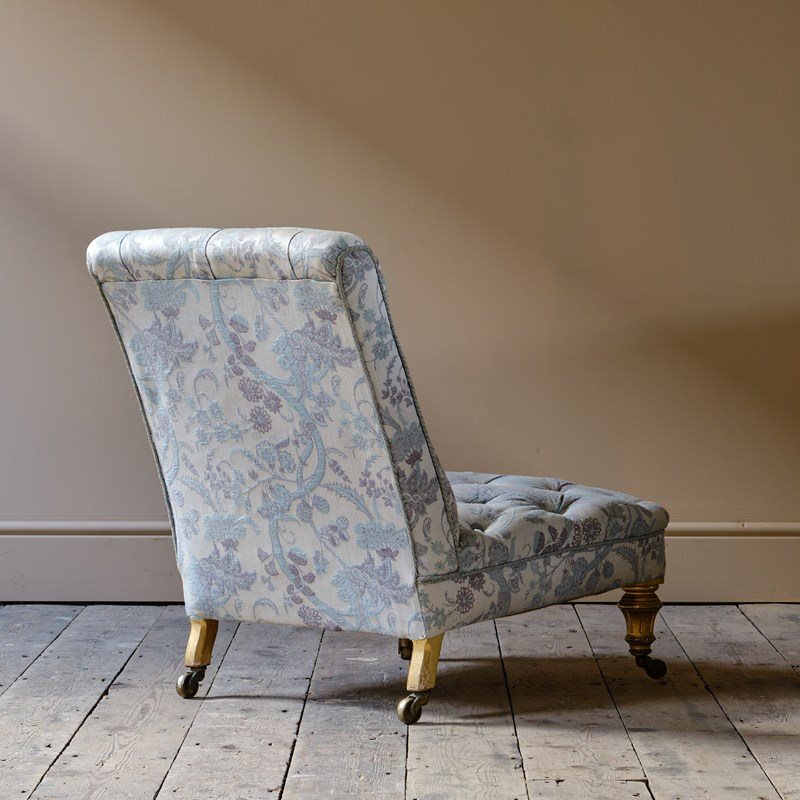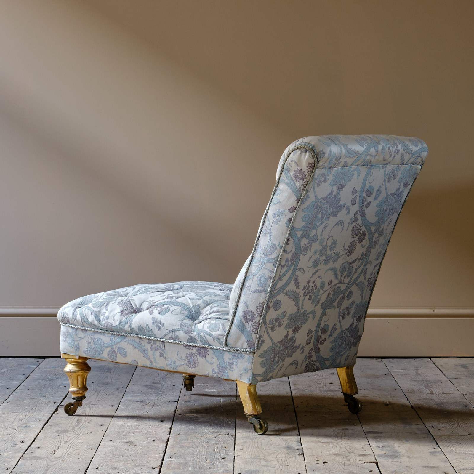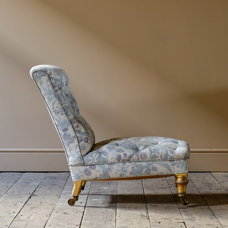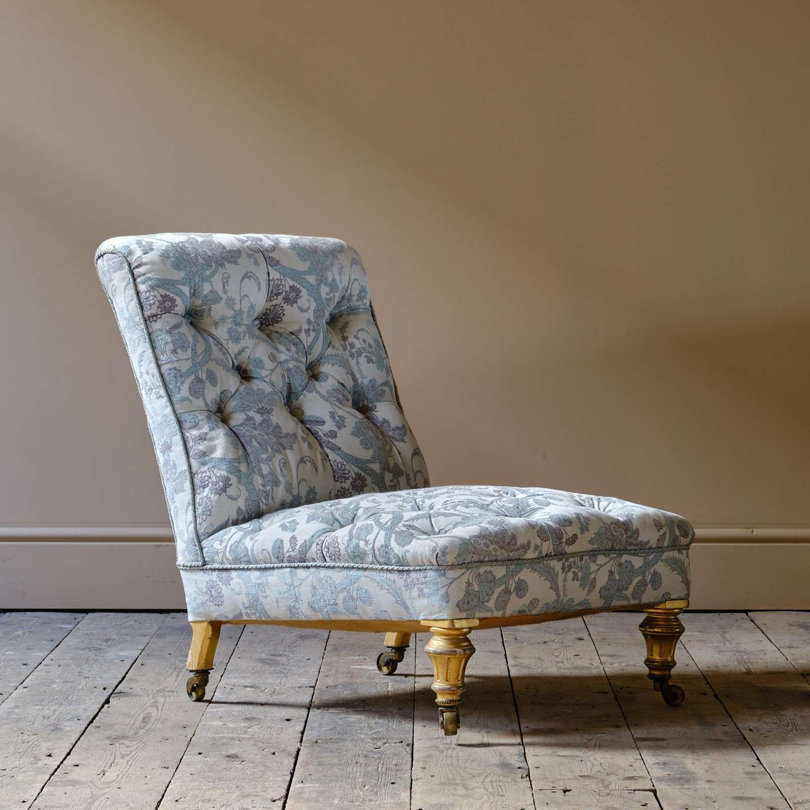 A good quality low and seep seated country house slipper chair. Raised on gilt walnut legs and the original brass casters.