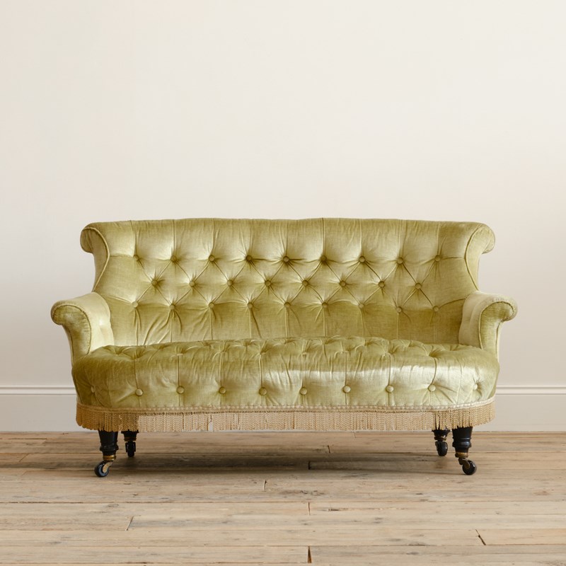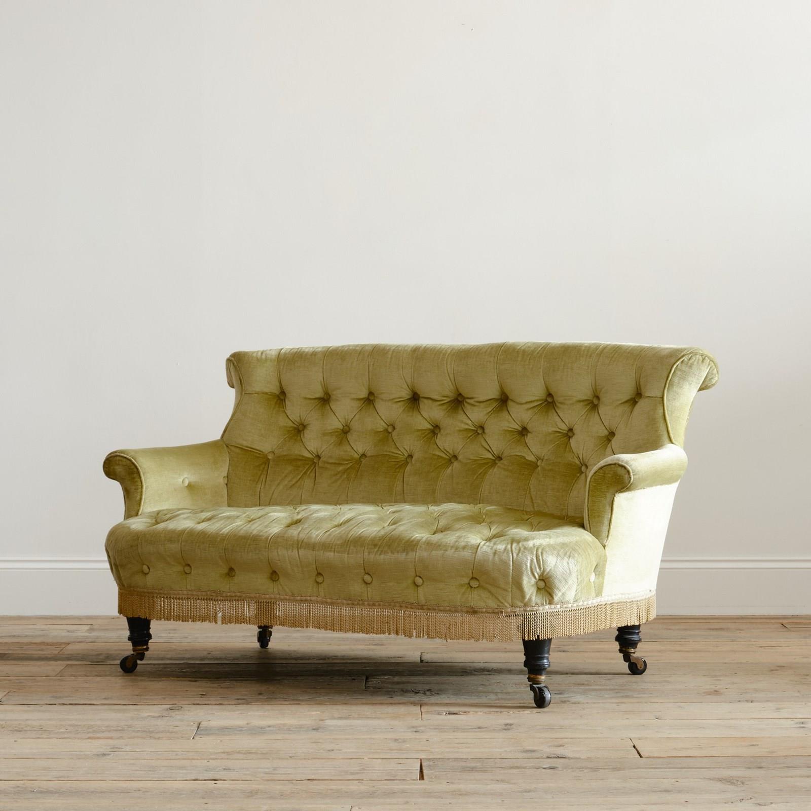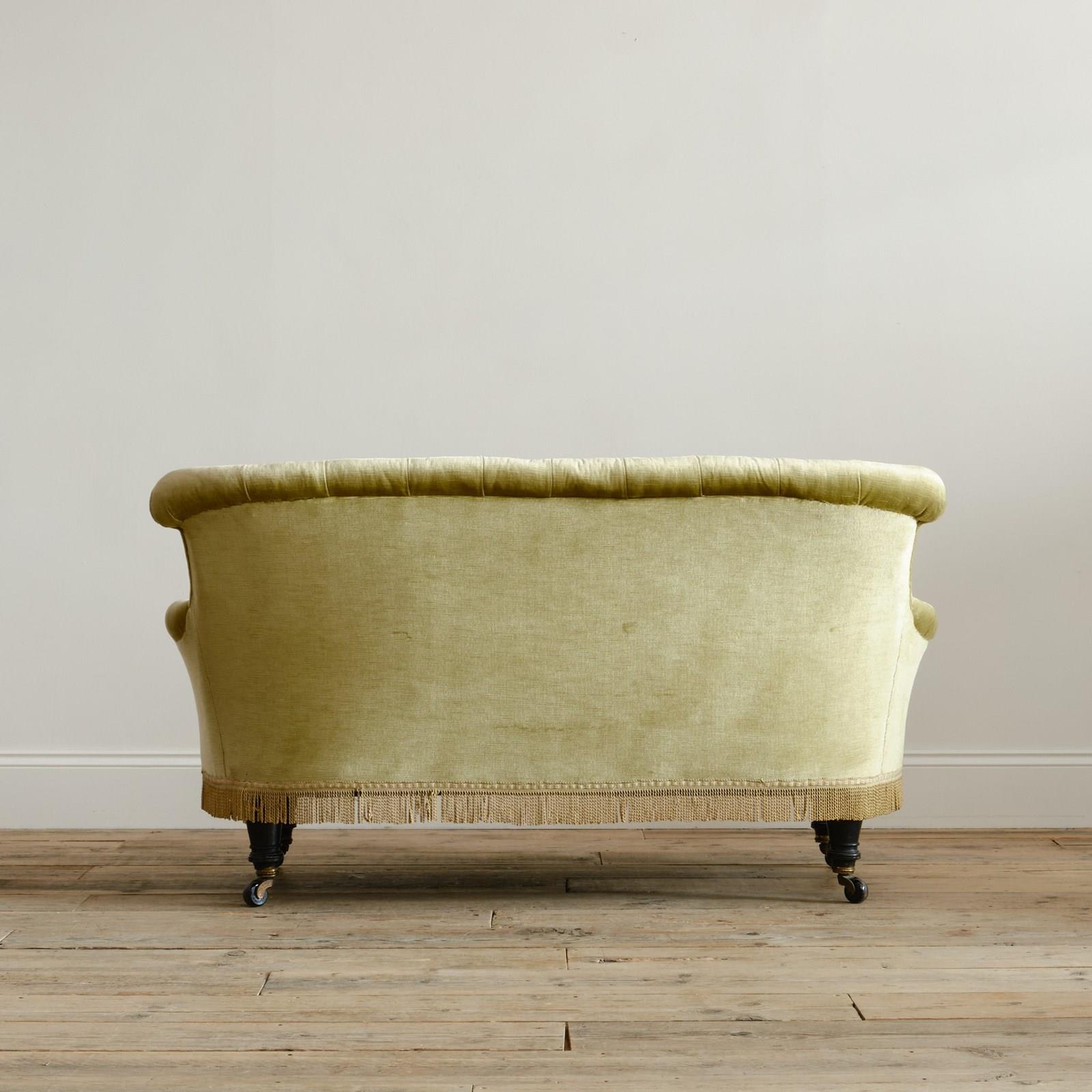 A good quality petite late 19th century country house 2 seater sofa. Raised on 4 turned ebonized legs with the original casters. The fully buttoned upholstery in good order and covered in sage green velvet with tussled trim.