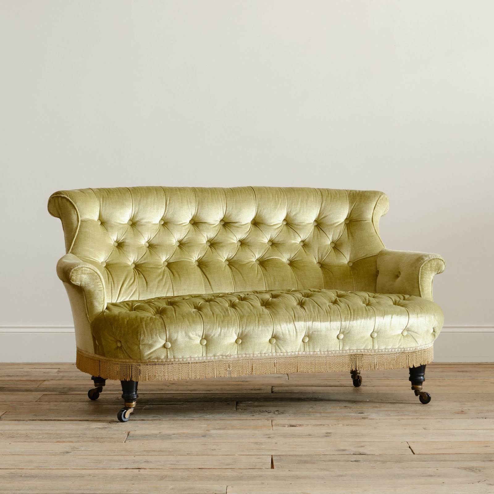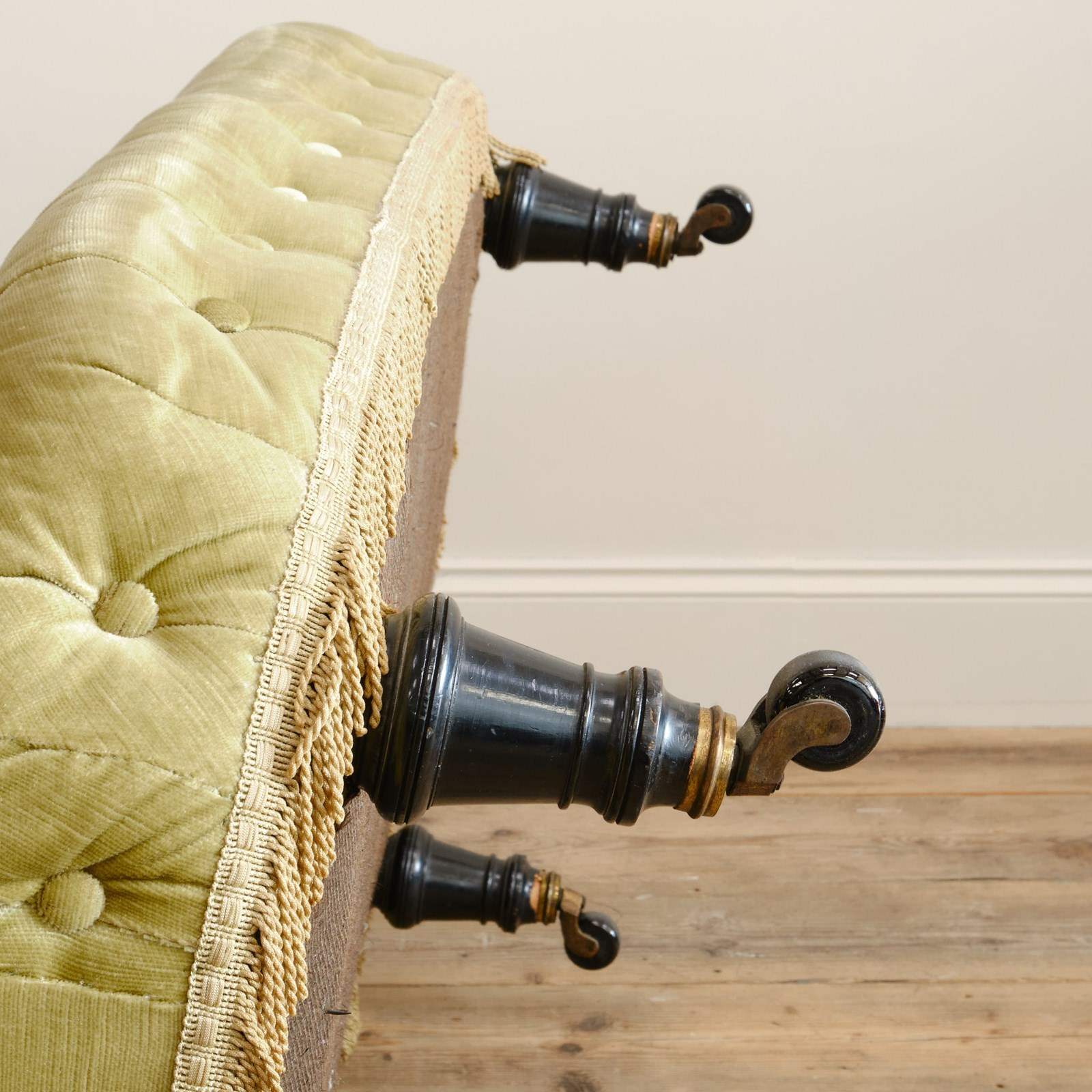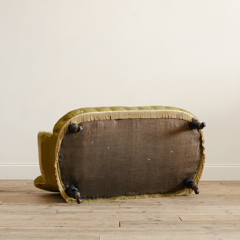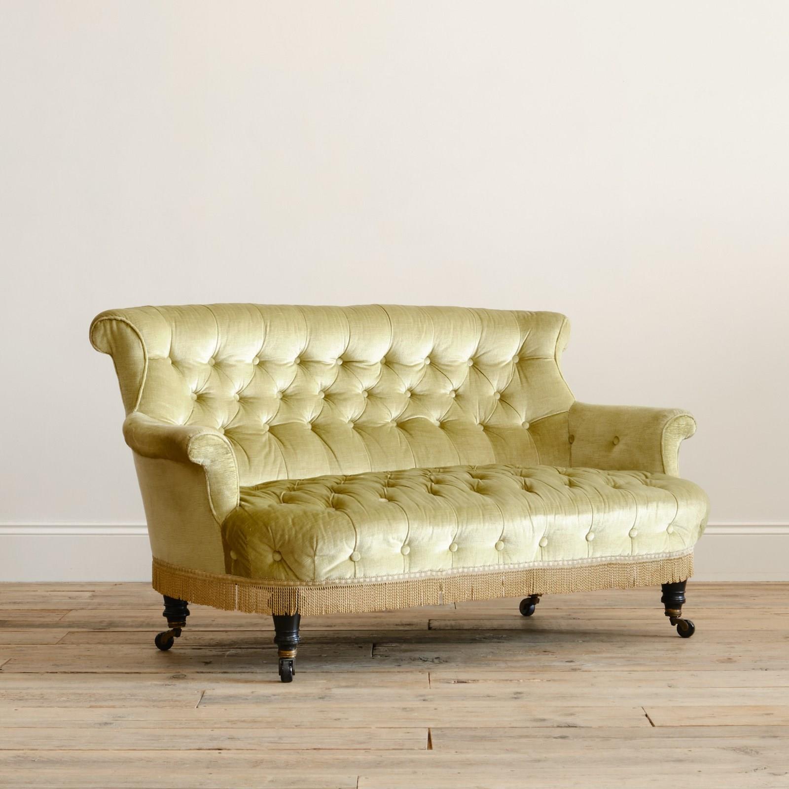 A good quality petite late 19th century country house 2 seater sofa. Raised on 4 turned ebonized legs with the original casters. The fully buttoned upholstery in good order and covered in sage green velvet with tussled trim.