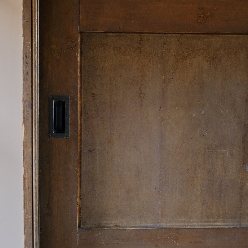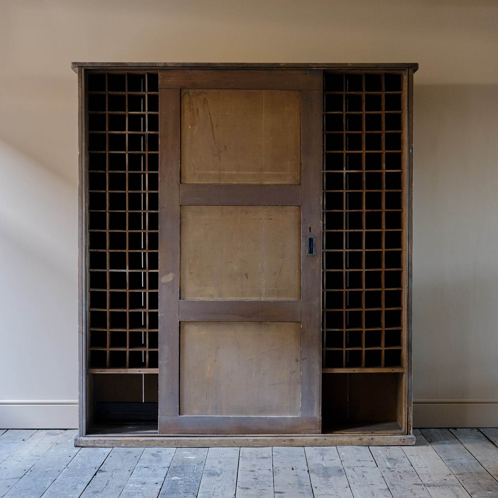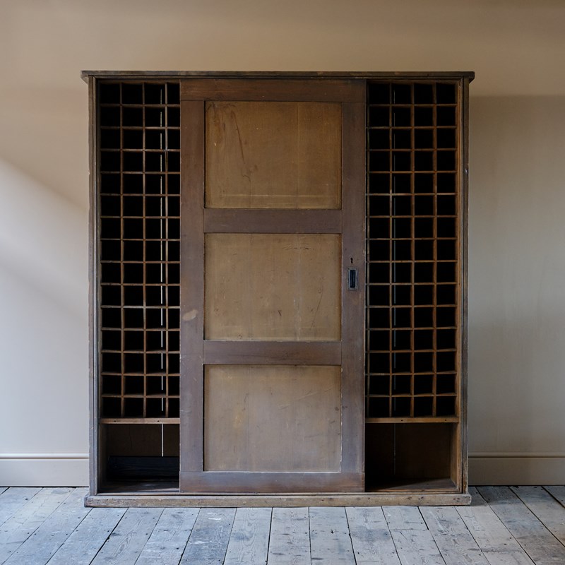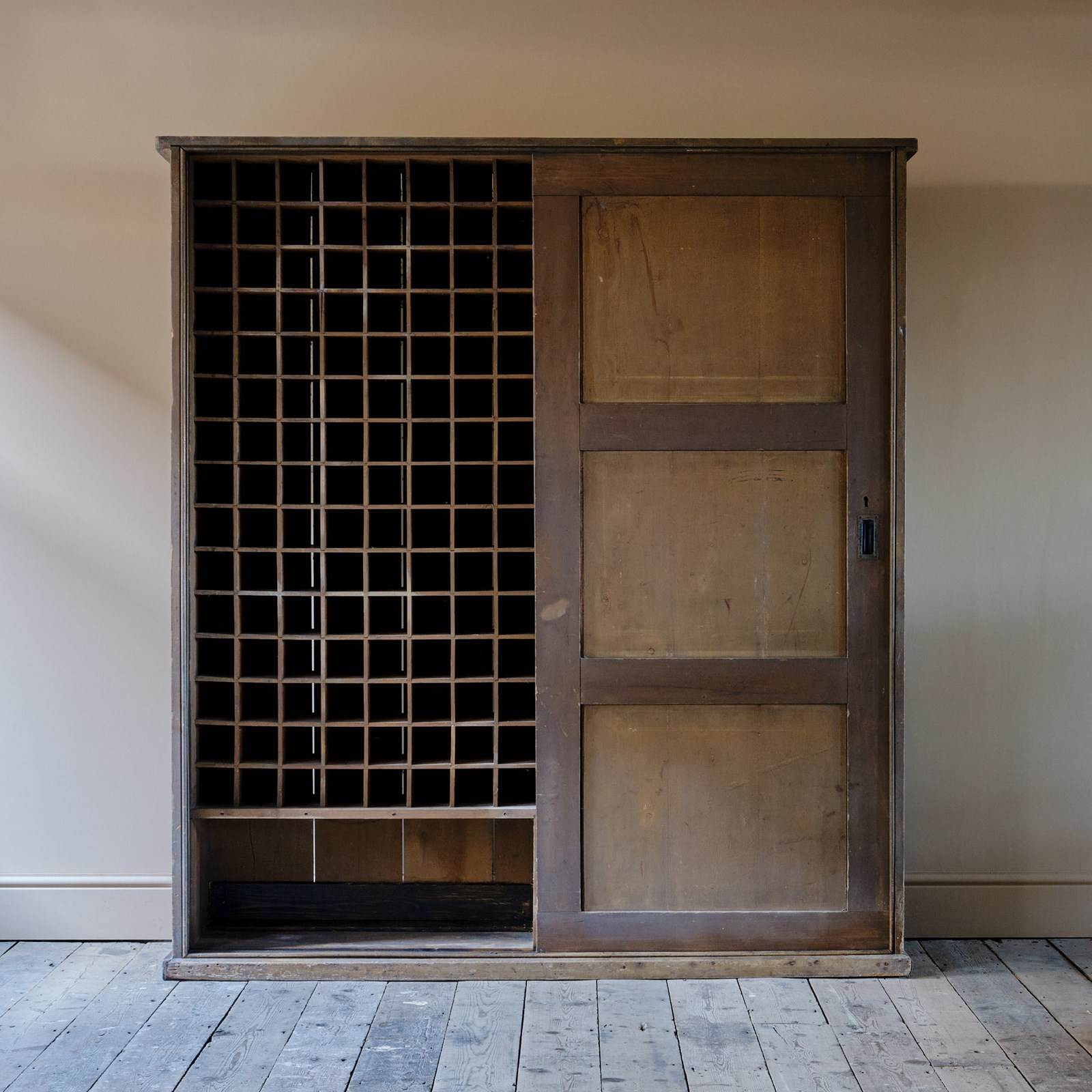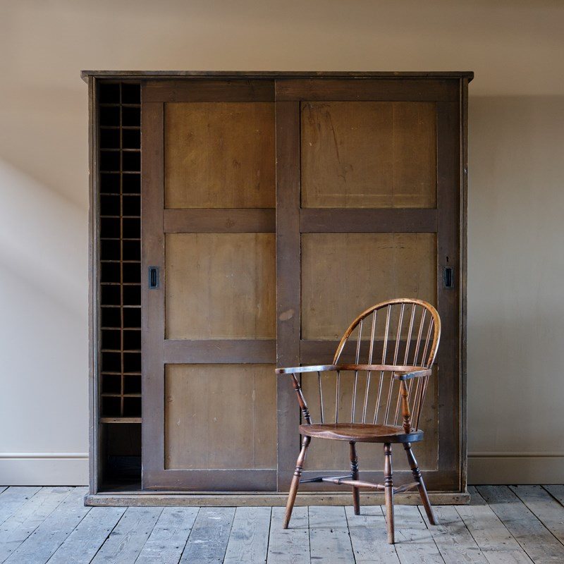 A huge 19th century country house purpose built wine cupboard. The sliding doors with brass handles open to reveal a gridded shelved interior that can fit 240 bottles of wine with 2 storage compartments to the base. The exterior of the cupboard retains its original dry paint.