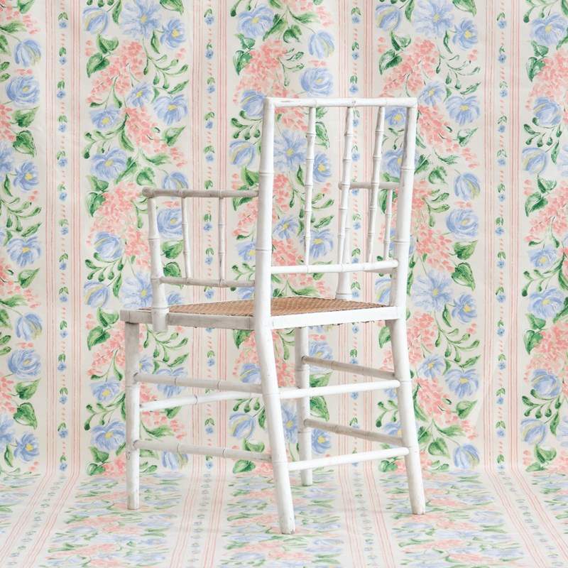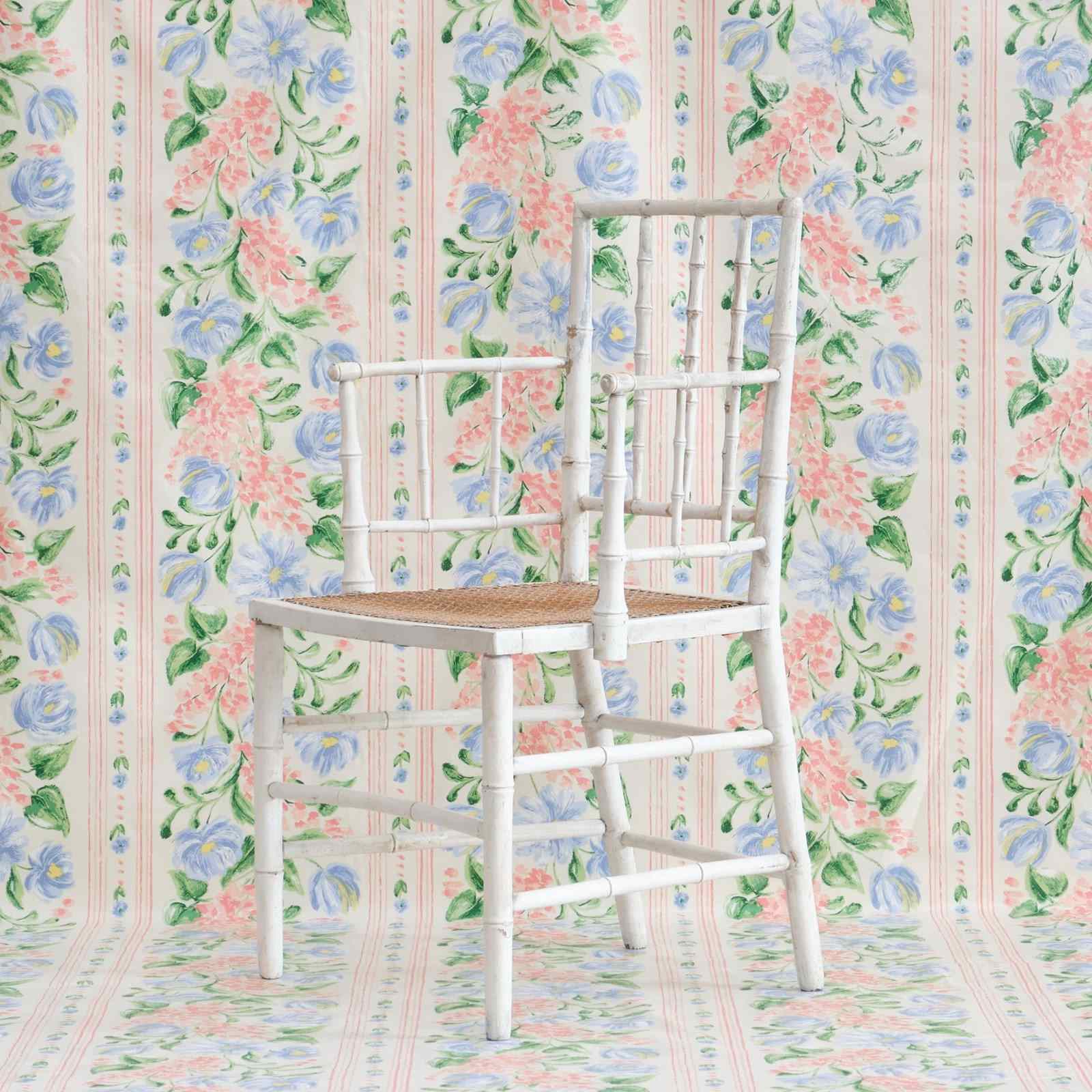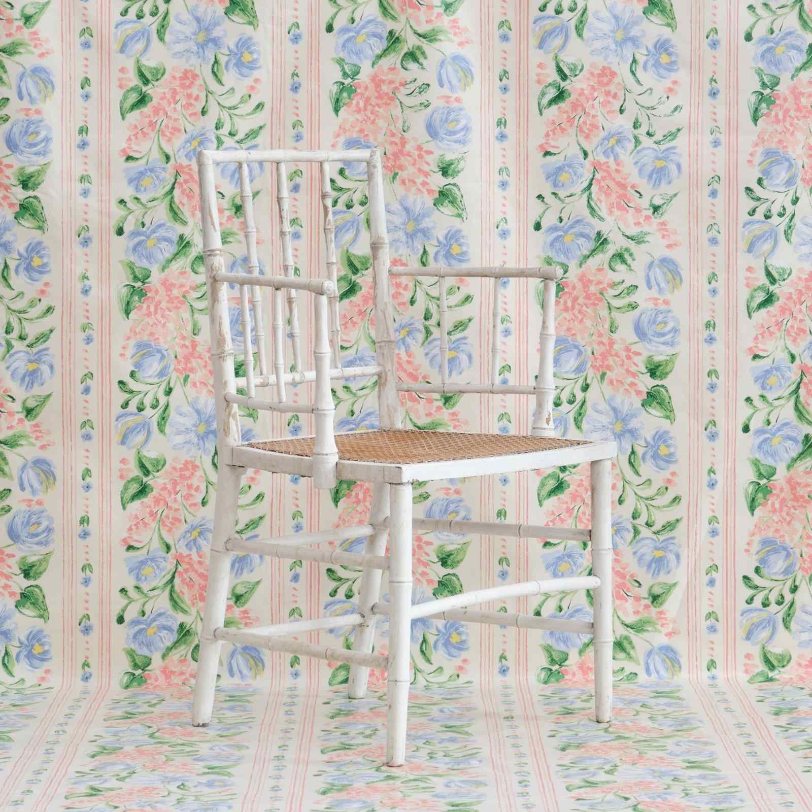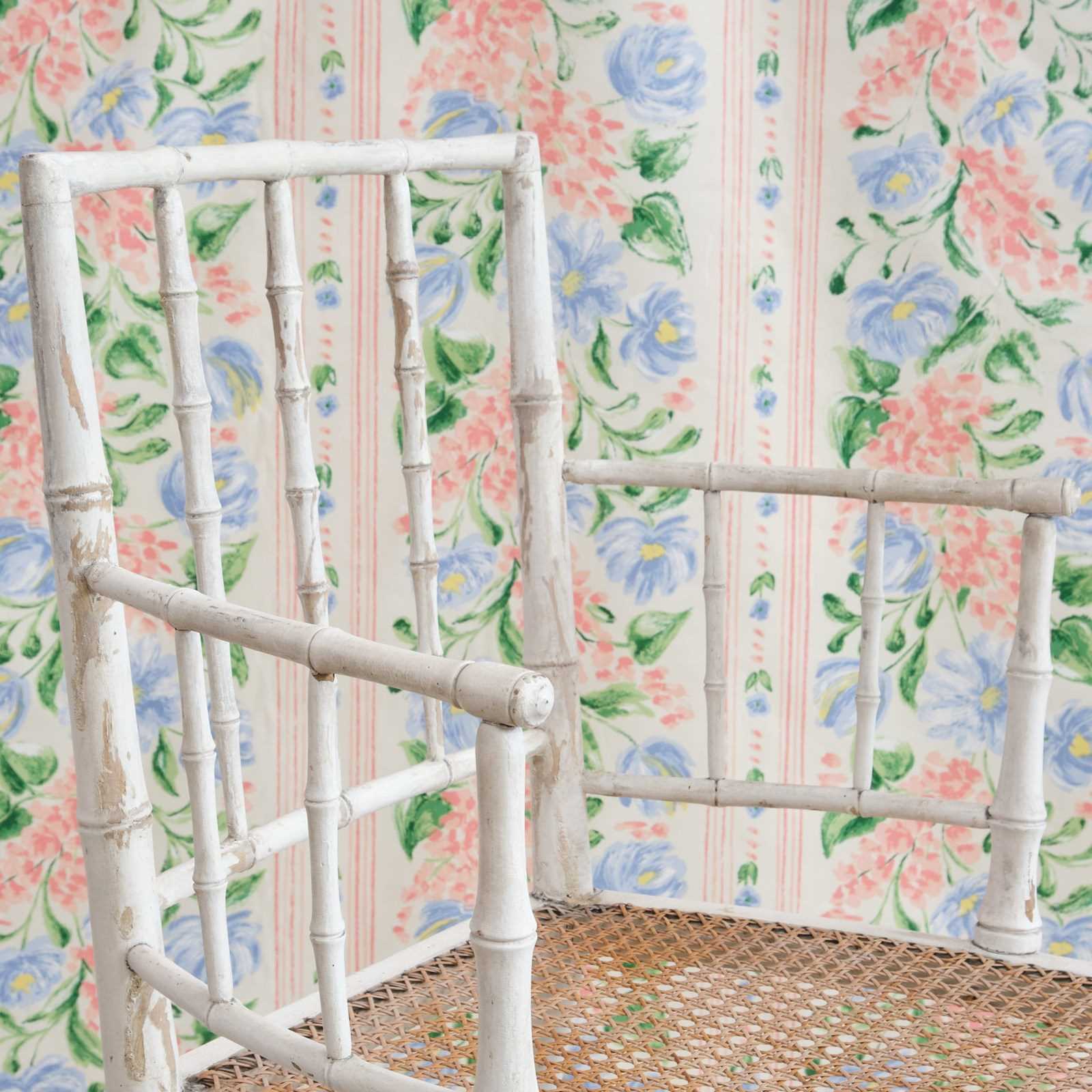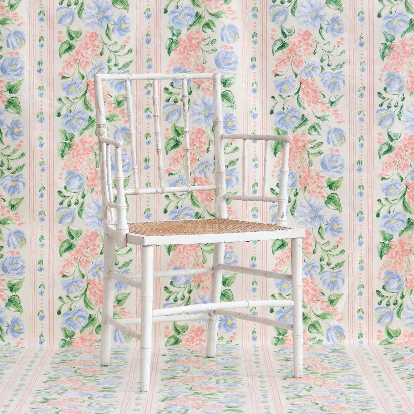 A 19th century armchair in turned faux bamboo beech with worn later paint and rattan seat.